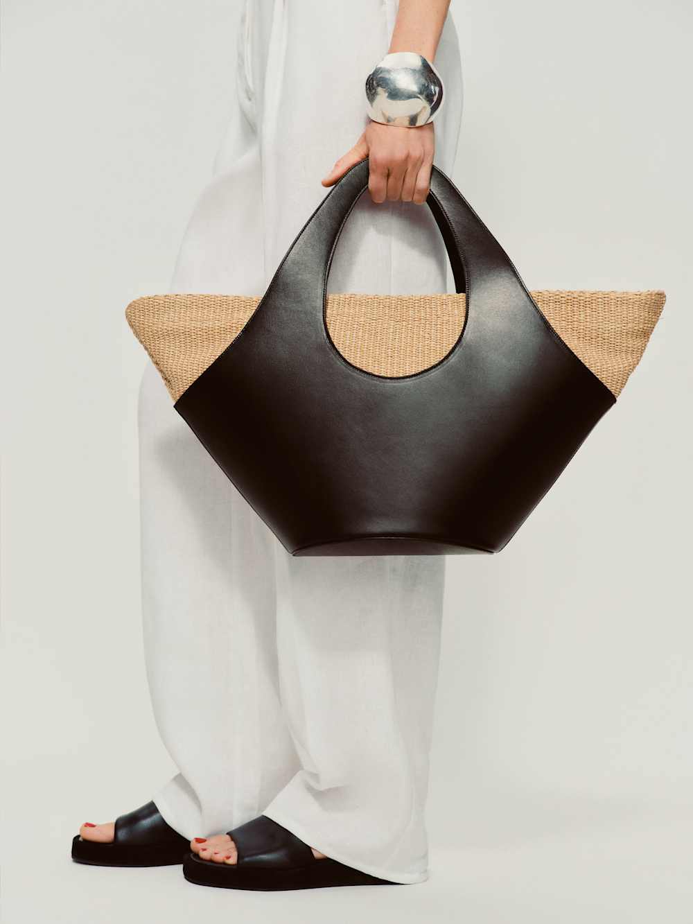 Hold me. Shop the Siena Top Handle Tote from Reformation, a triangular shaped tote bag with a top handle.