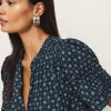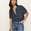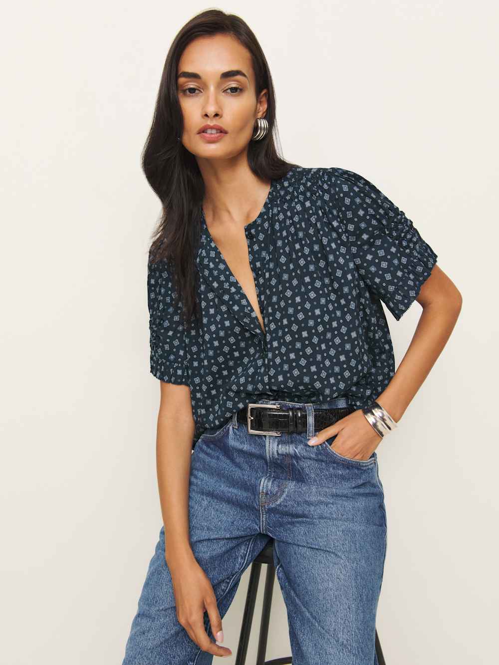 Up top. Shop the Adeline Top from Reformation, a relaxed-fitting top with puff sleeves and an adjustable button neckline.