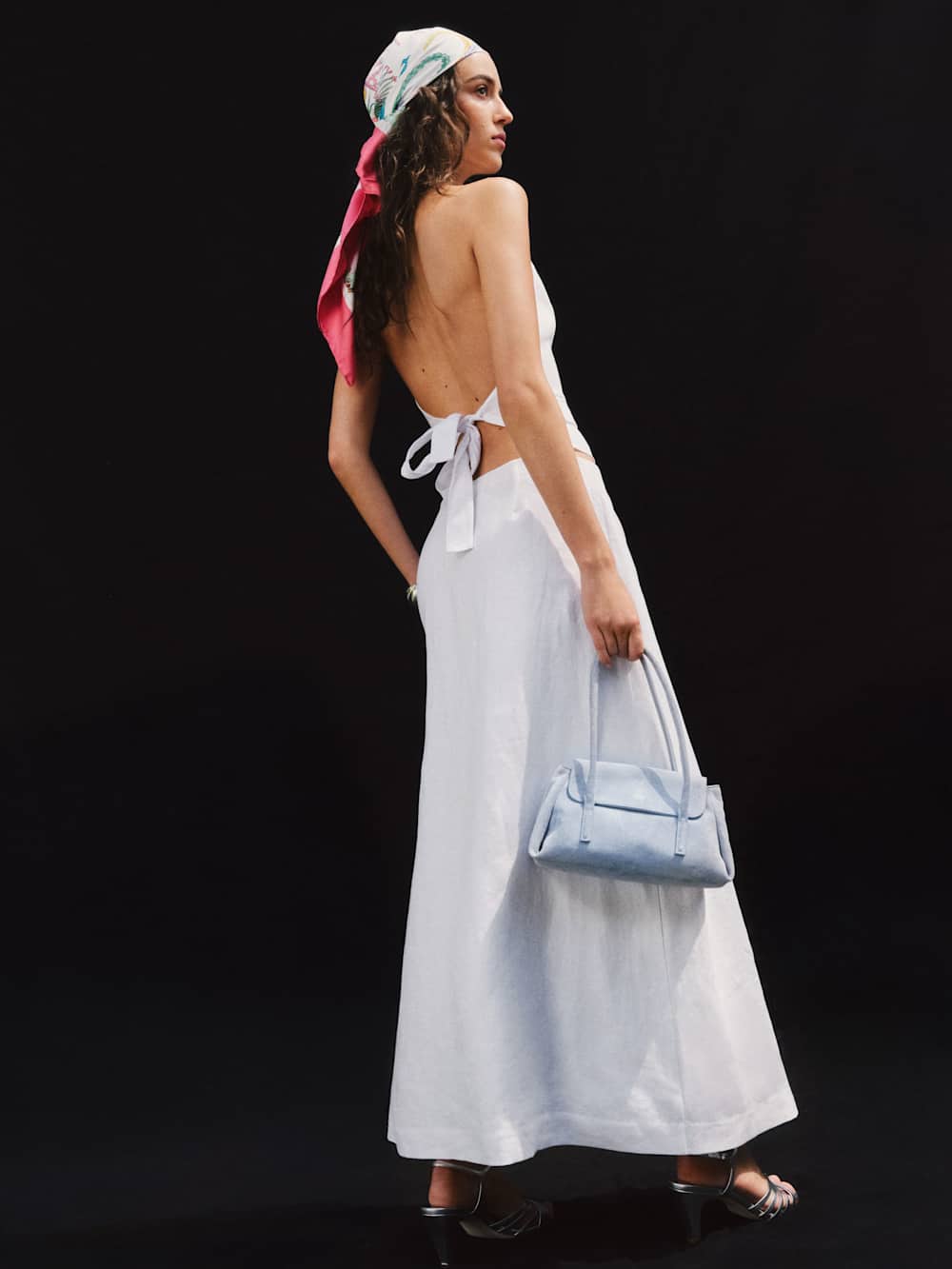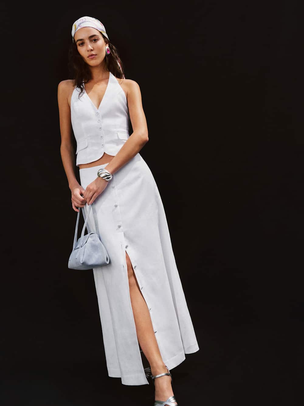 Who, me. Shop the Aida Linen Vest from Reformation, a sleeveless vest with a halter neckline, button detailing, and an open back with an adjustable tie.