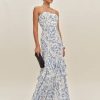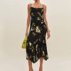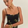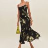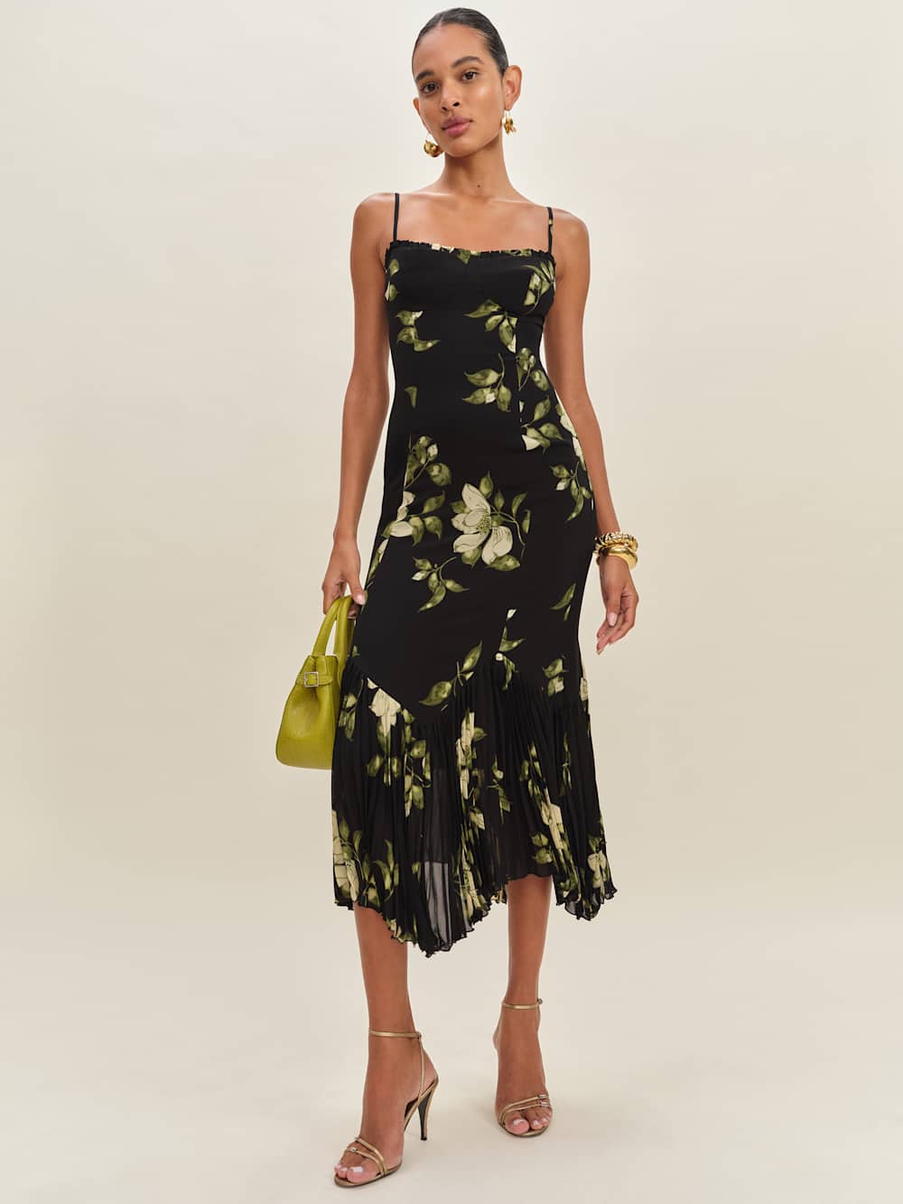 How dreamy. Shop the Aiko Dress from Reformation, a midi length dress with a sweetheart neckline, bust cup seams, ruffling at the neckline, and a pleated hem.