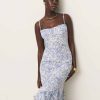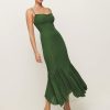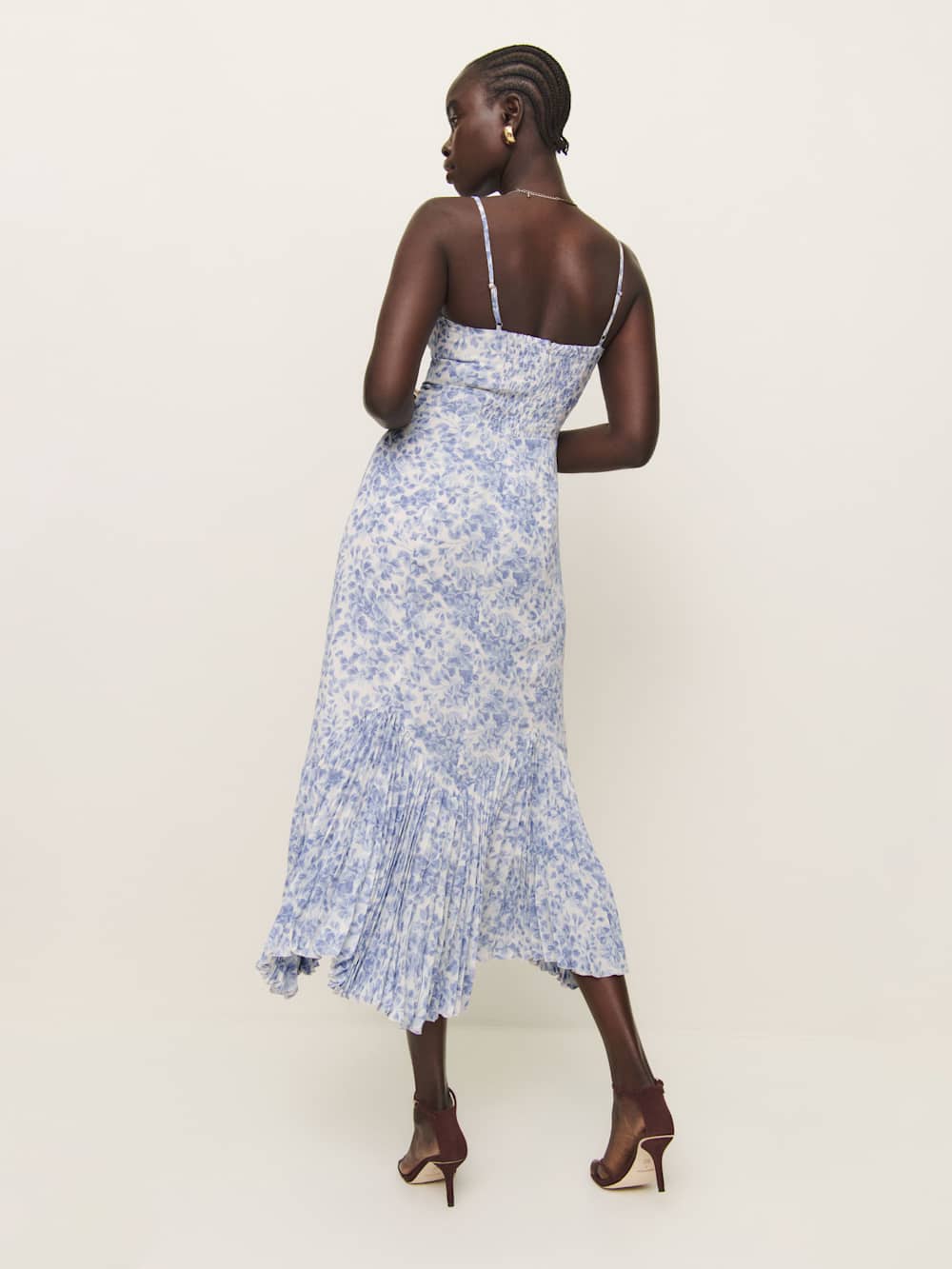 How dreamy. Shop the Aiko Dress from Reformation, a midi length dress with a sweetheart neckline, bust cup seams, ruffling at the neckline, and a pleated hem.