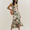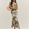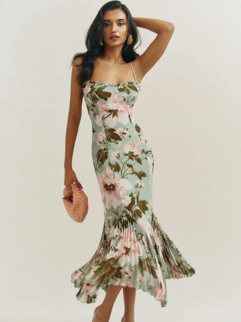 How dreamy. Shop the Aiko Dress from Reformation, a midi length dress with a sweetheart neckline, bust cup seams, ruffling at the neckline, and a pleated hem.