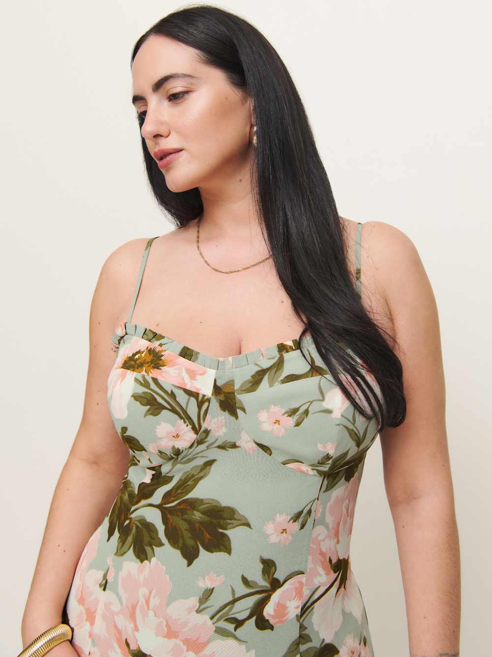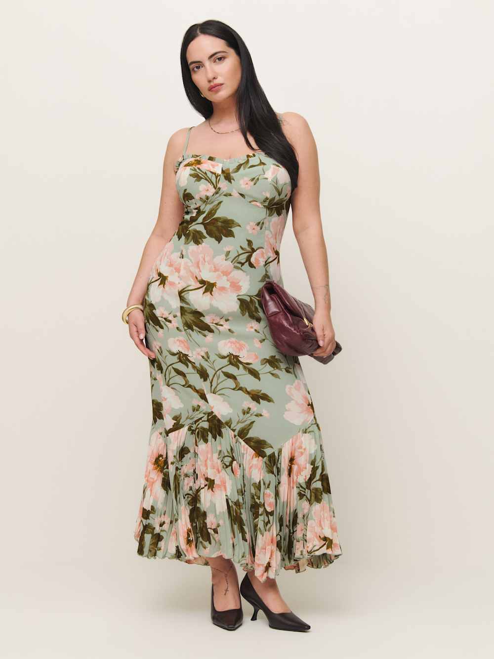 How dreamy. Shop the Aiko Dress ES from Reformation, a midi-length dress with a sweetheart neckline, bust cup seams, ruffling at the neck, and a pleated hem.