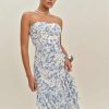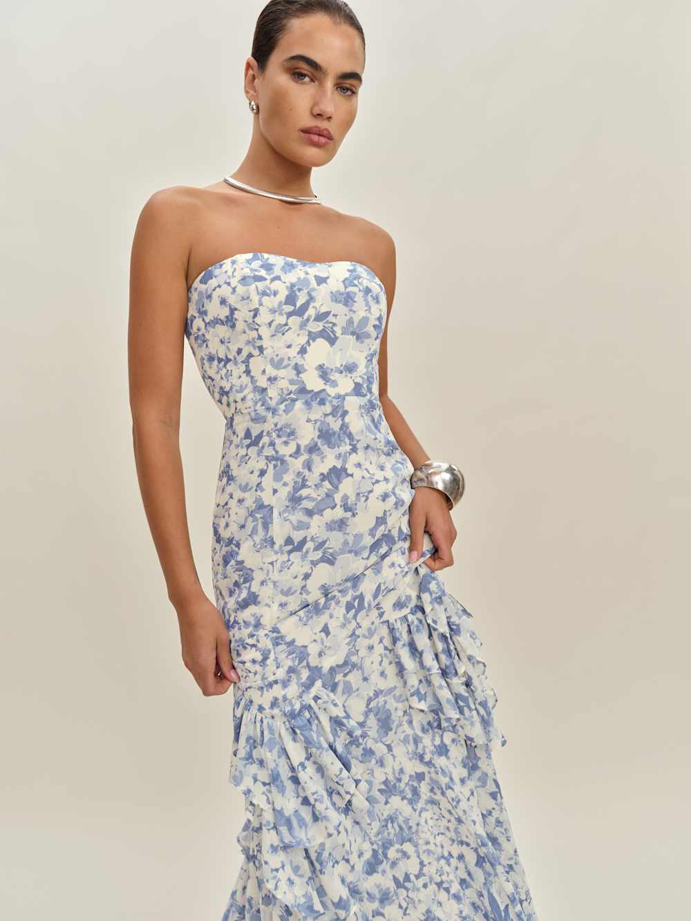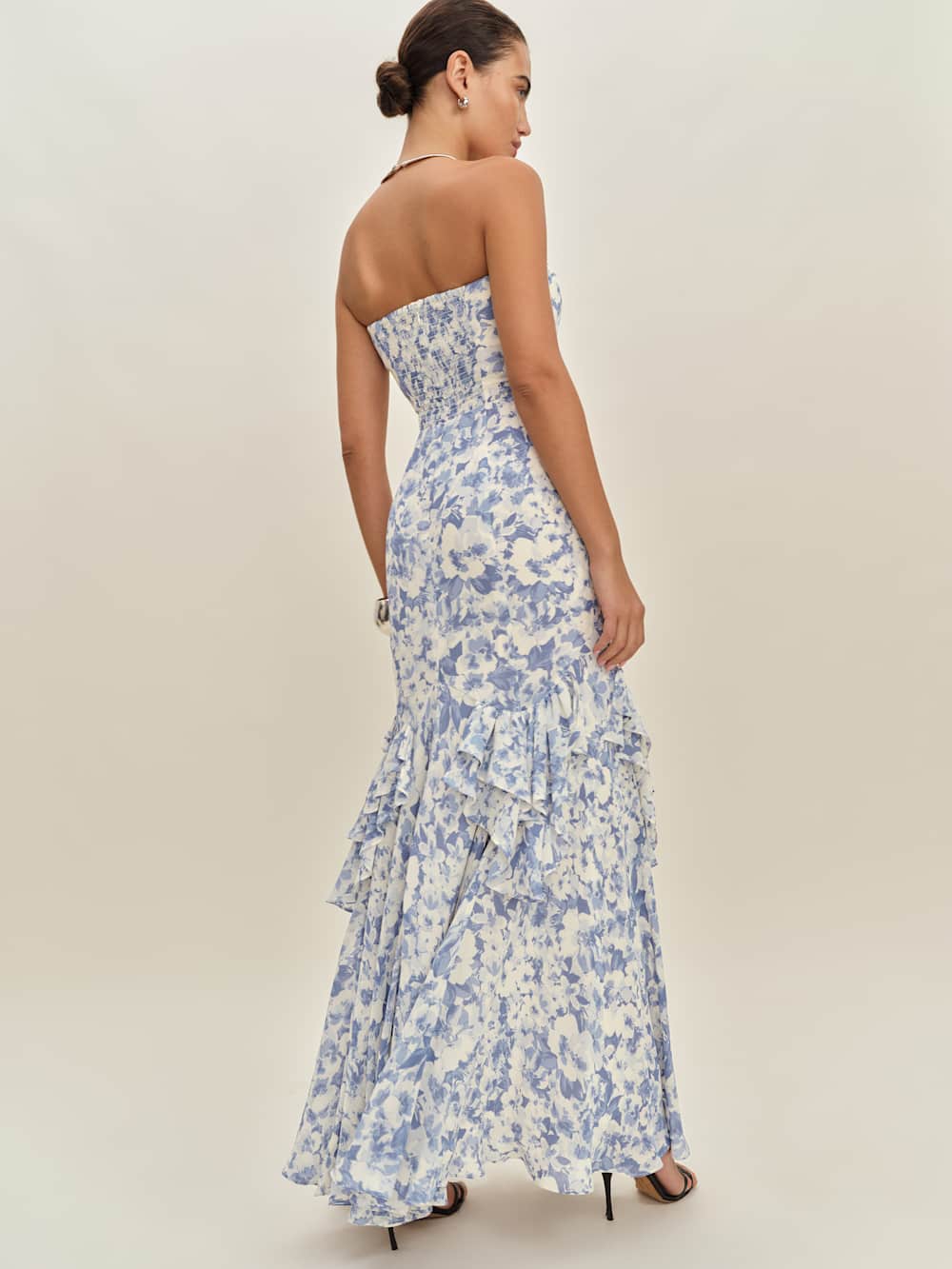 How classic. Shop the Aivana Dress from Reformation, a strapless full length dress with a sweetheart neckline and ruffle detailing at the skirt.