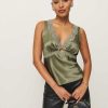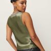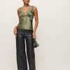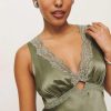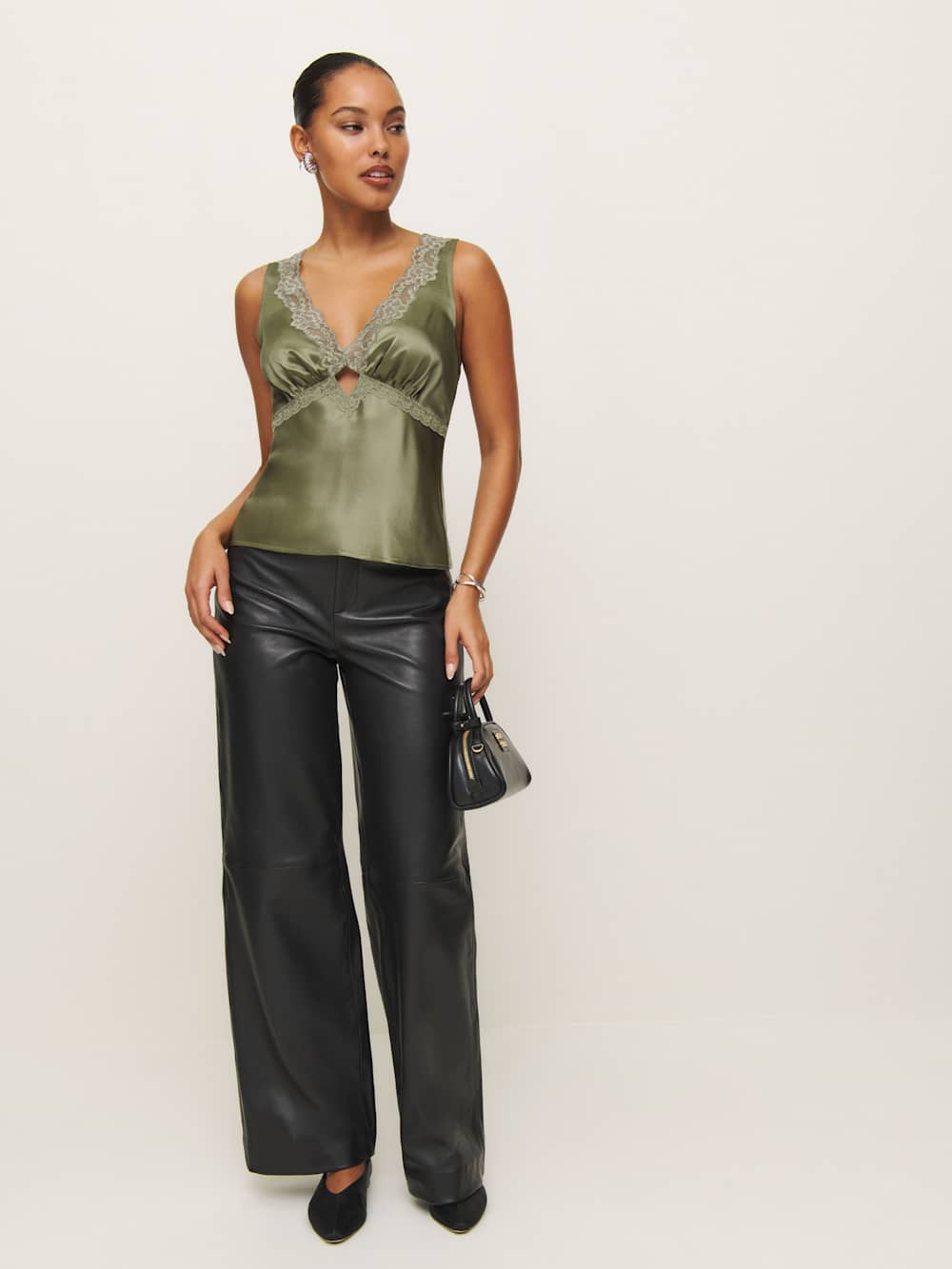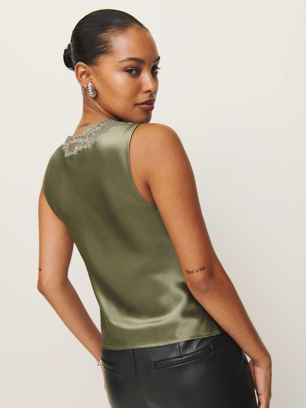 Up top. Shop the Aliceyn Silk Top from Reformation, a sleeveless top with a v-neckline, cutout, and lace detailing throughout.