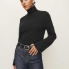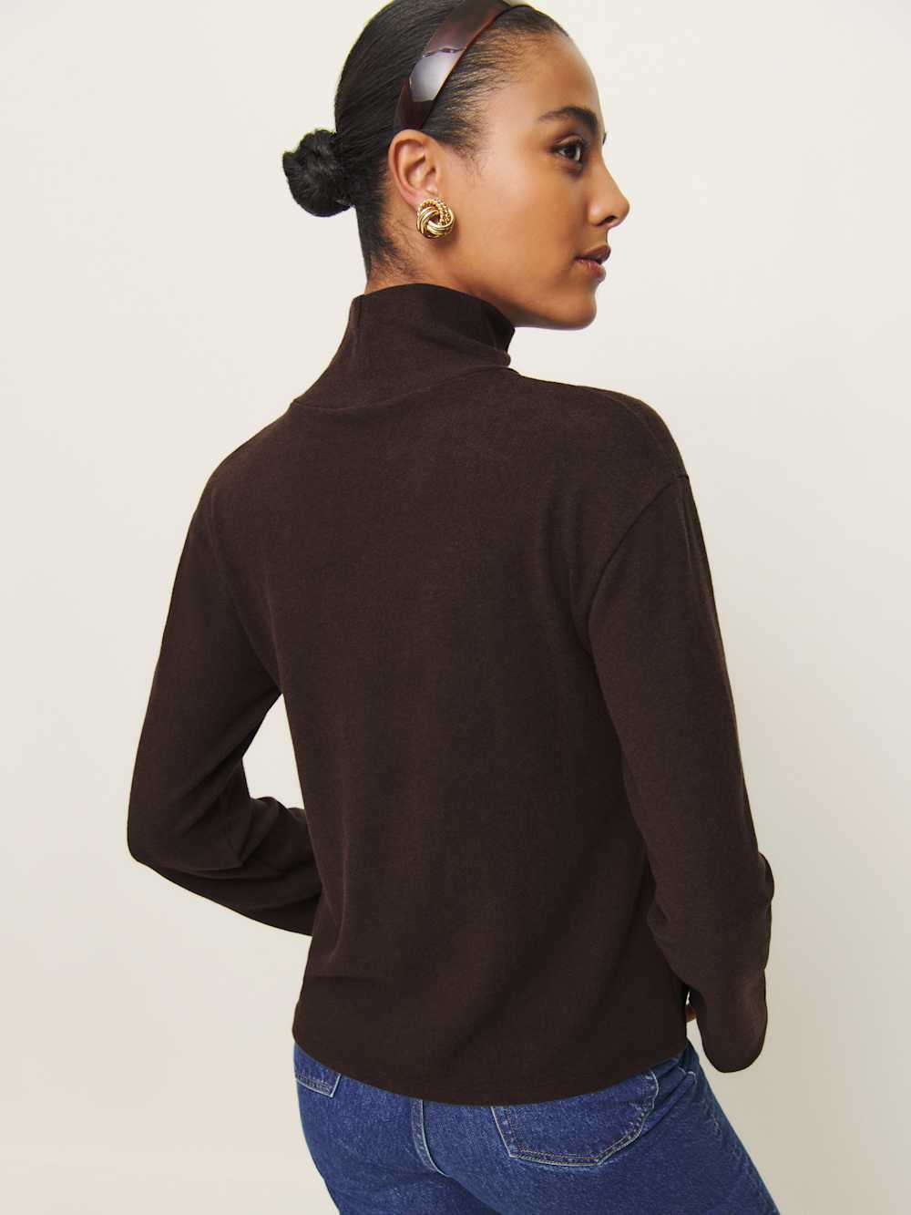 Up top. Shop the Anya Knit Top from Reformation, a long-sleeved top with a turtle neck, flared sleeves, and a relaxed fit throughout.