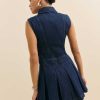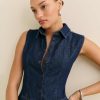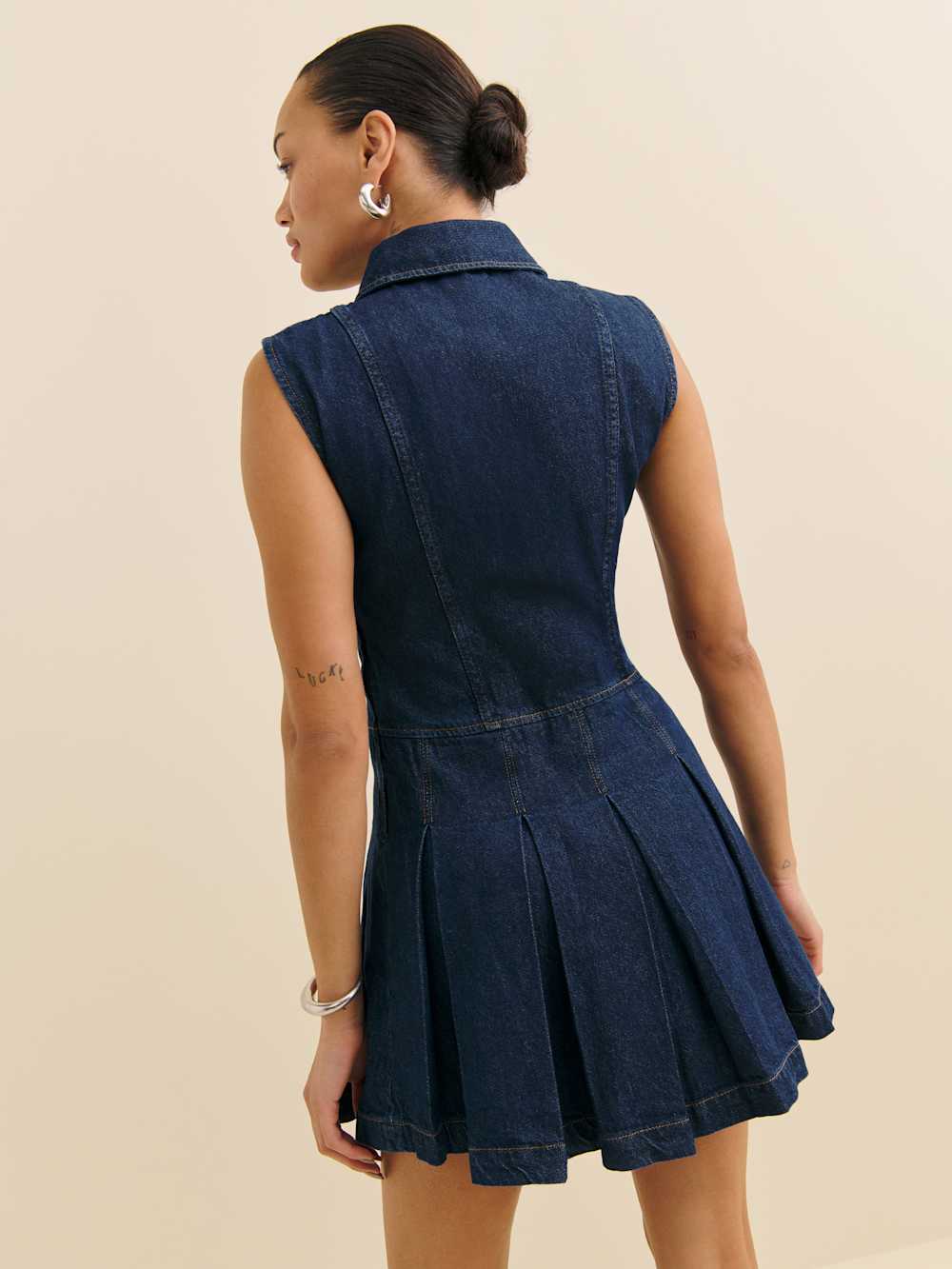 Denim time. Shop the Arella Denim Mini Dress from Reformation, a sleeveless mini dress with a collared neckline, adjustable buttons, and a pleated skirt.