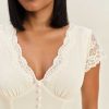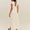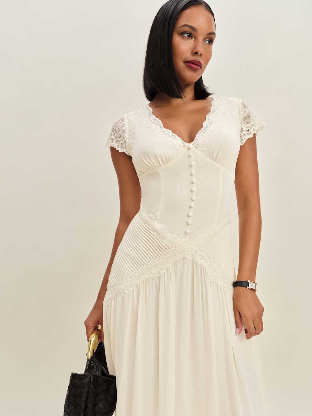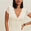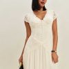 Shop the Arianne Dress from Reformation, a short sleeve midi dress with a v neckline, lace trim, and a drop waist.