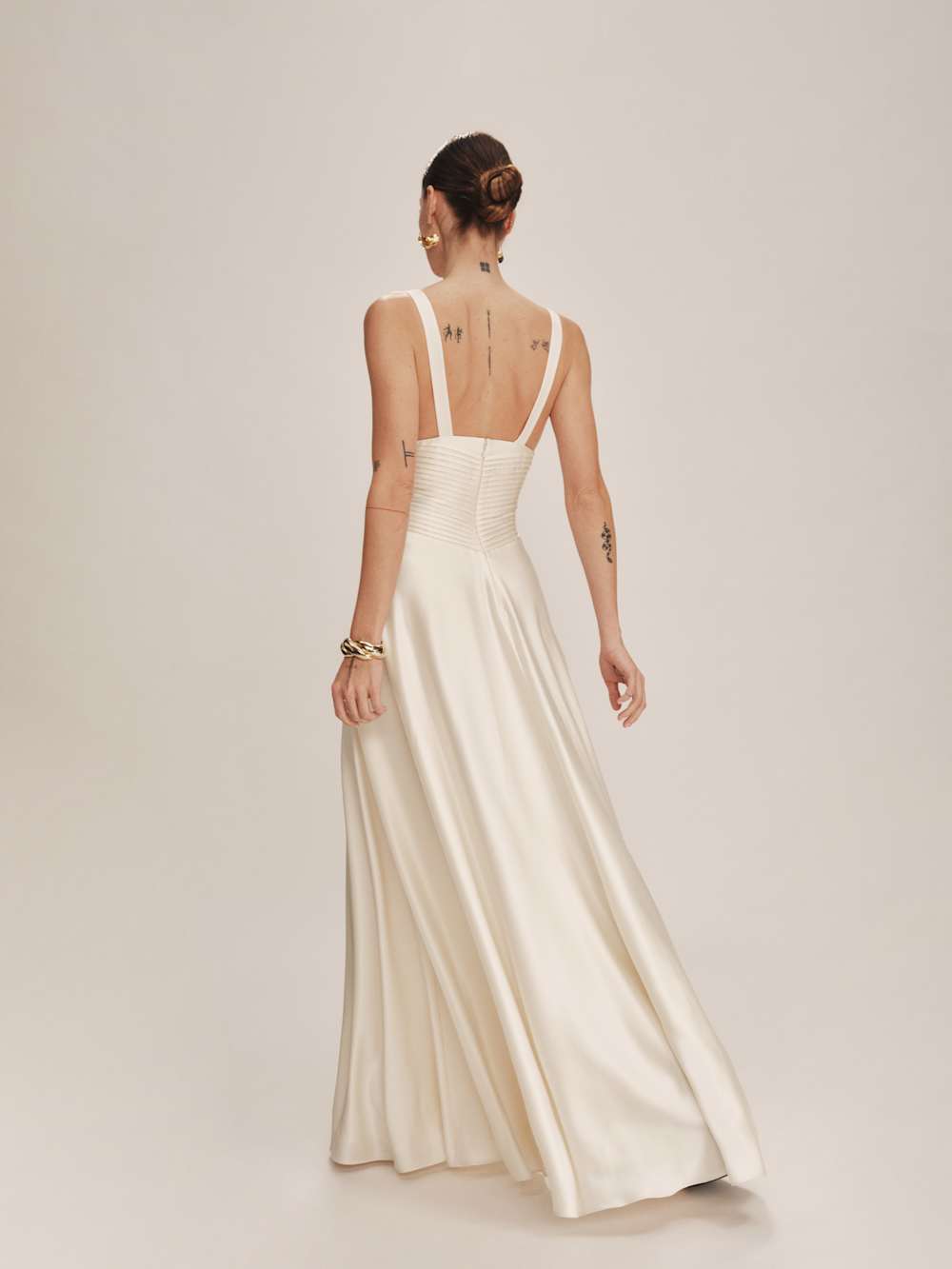 Wear the dress. Shop the Arianwen Satin Dress from Reformation, a sleeveless full-length dress with a deep v-neckline and button detailing down the bodice.