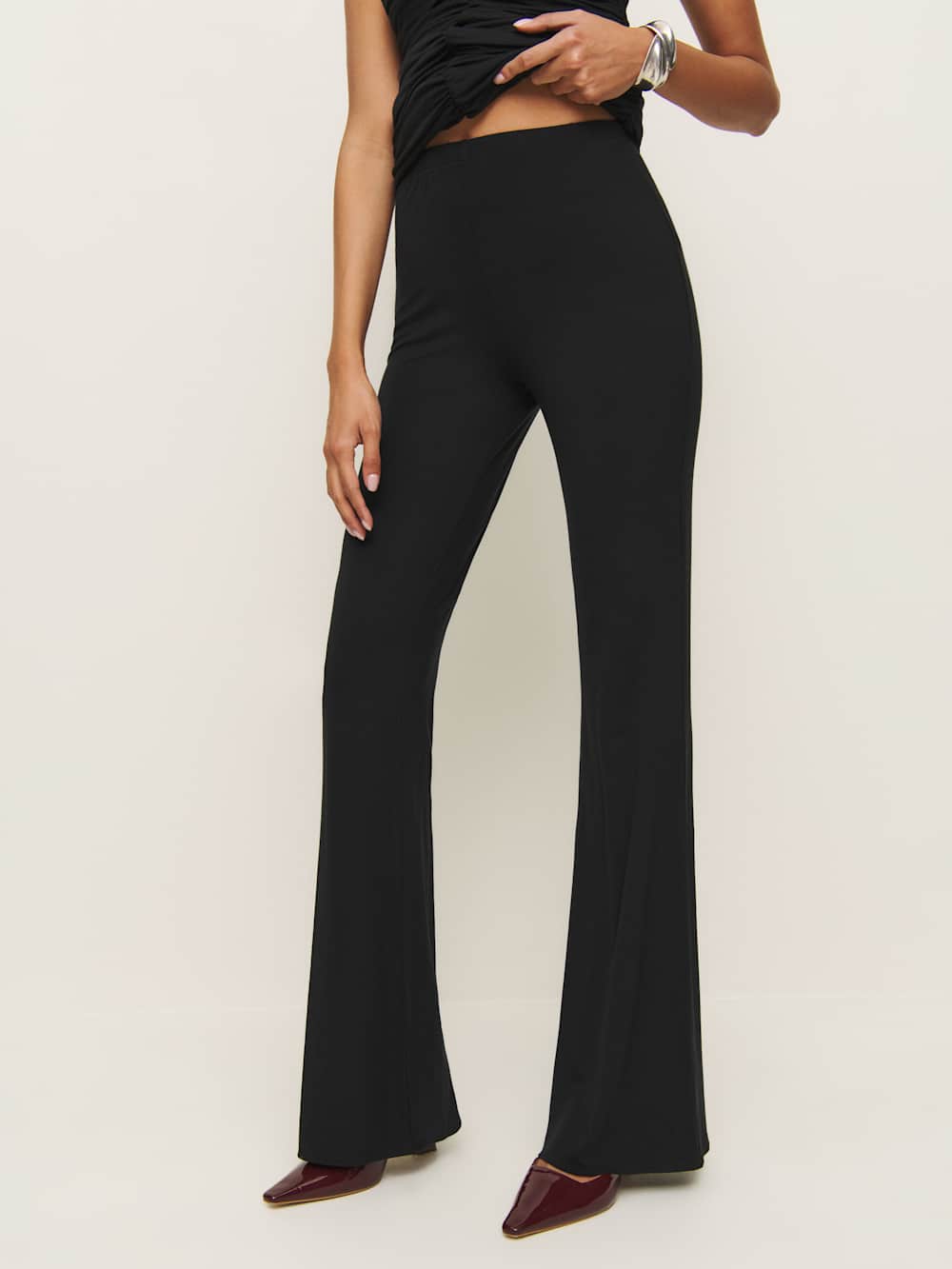 Soft and stretchy. If you’re into that. Shop the Arlo Knit Two Piece from Reformation, a two-piece set with a strapless ruched top and matching knit pants.