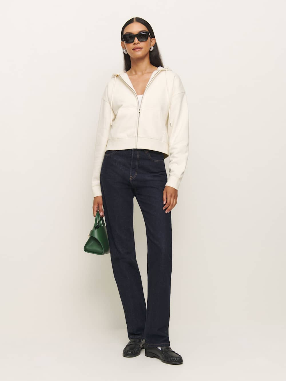 Shop the Austin Zip Up Hoodie from Reformation, a cropped sweatshirt with a zipper and hood.
