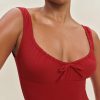 Shop the Bahia One Piece Swimsuit from Reformation, a sleevless one piece swimsuit with ruching at the neckline and an adjustable tie.