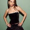 Up top. Shop the Bailee Velvet Top from Reformation, a sleeveless top with a straight neckline and a rhinestone trim.