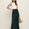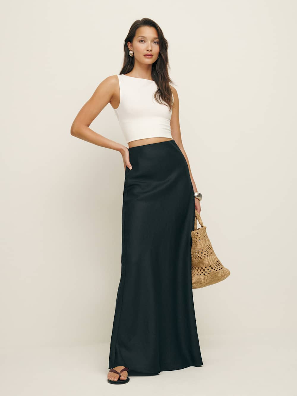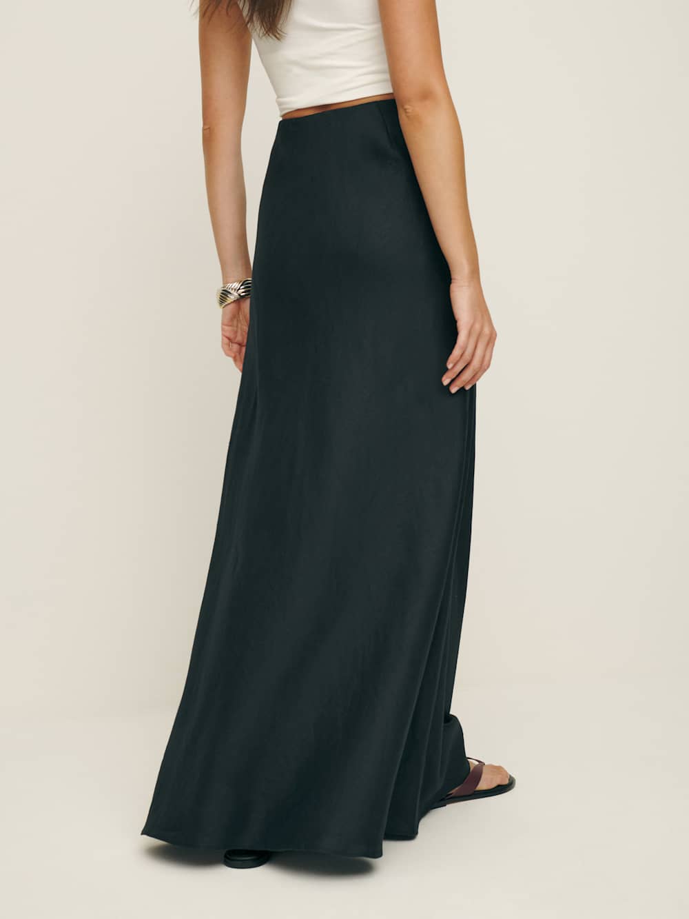 Let your skirt do the talking. Shop the Bella Linen Skirt from Reformation, a bias cut maxi skirt with an elasticated waist.