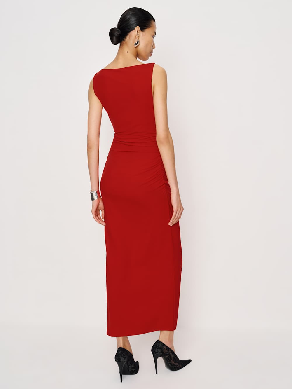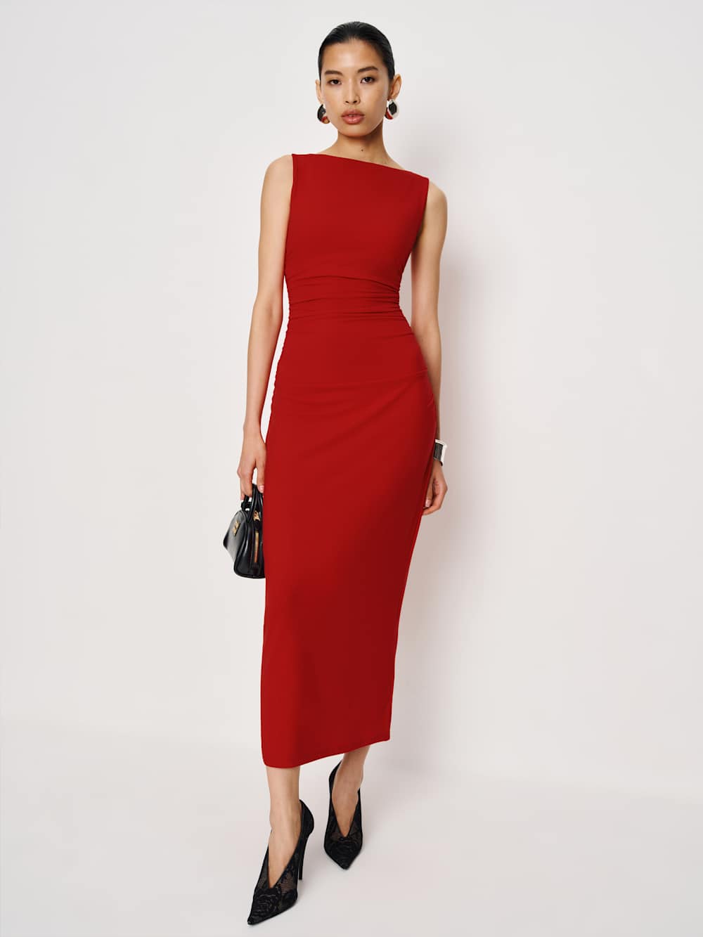 Get some compliments. Shop the Benson Knit Dress from Reformation, a sleeveless midi dress with a boat neckline and ruching throughout.