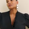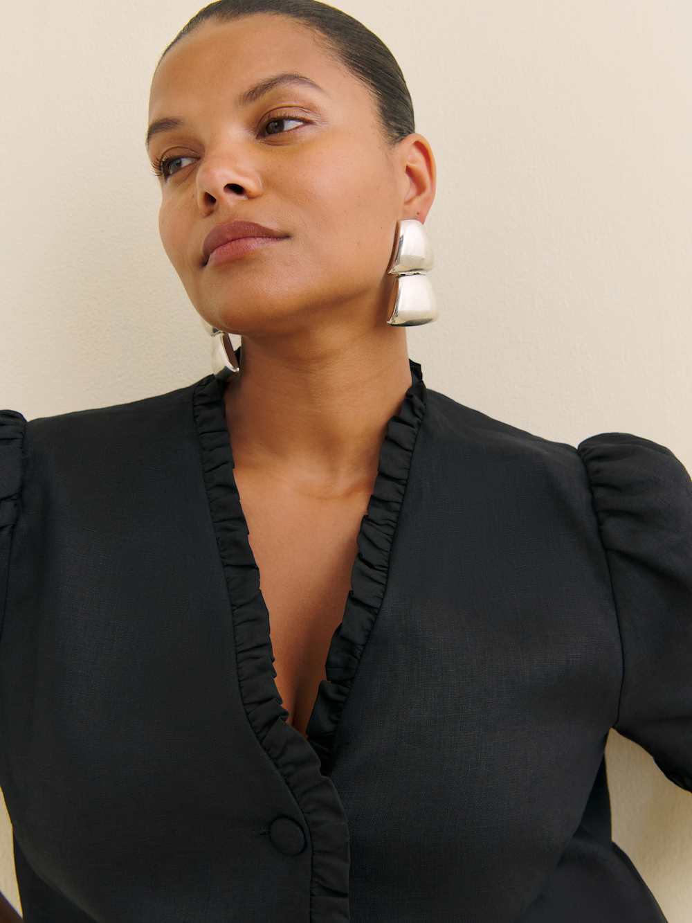 It’s called liking nature. Shop the Bess Linen Top ES from Reformation, a short-sleeved button down top with puffed sleeves and a ruffled hem.