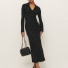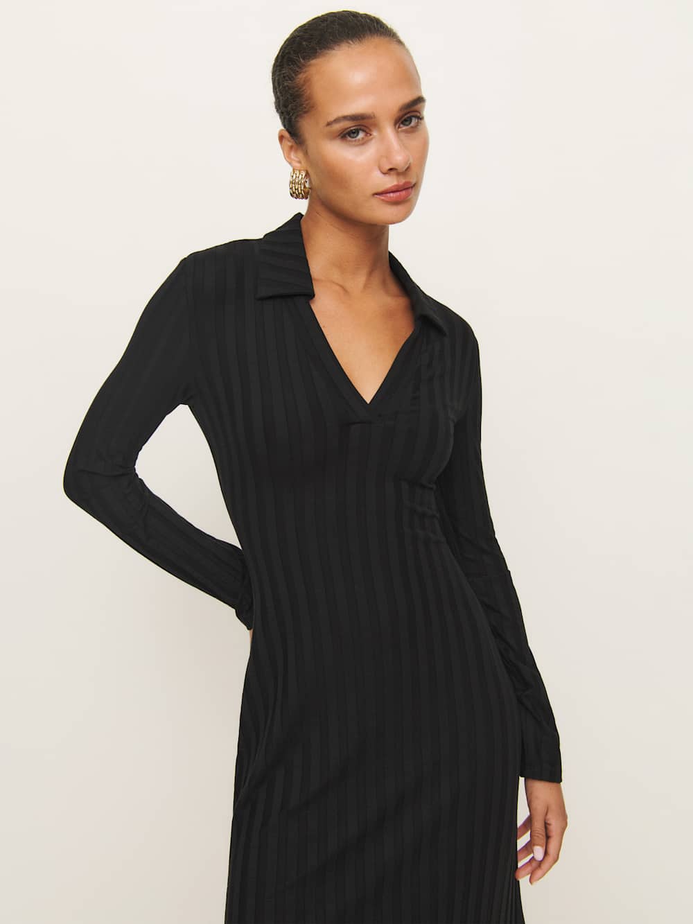 Wear the dress. Shop the Blaire Knit Dress from Reformation, a long-sleeve midi dress with a collared V-neckline and ribbing throughout.