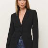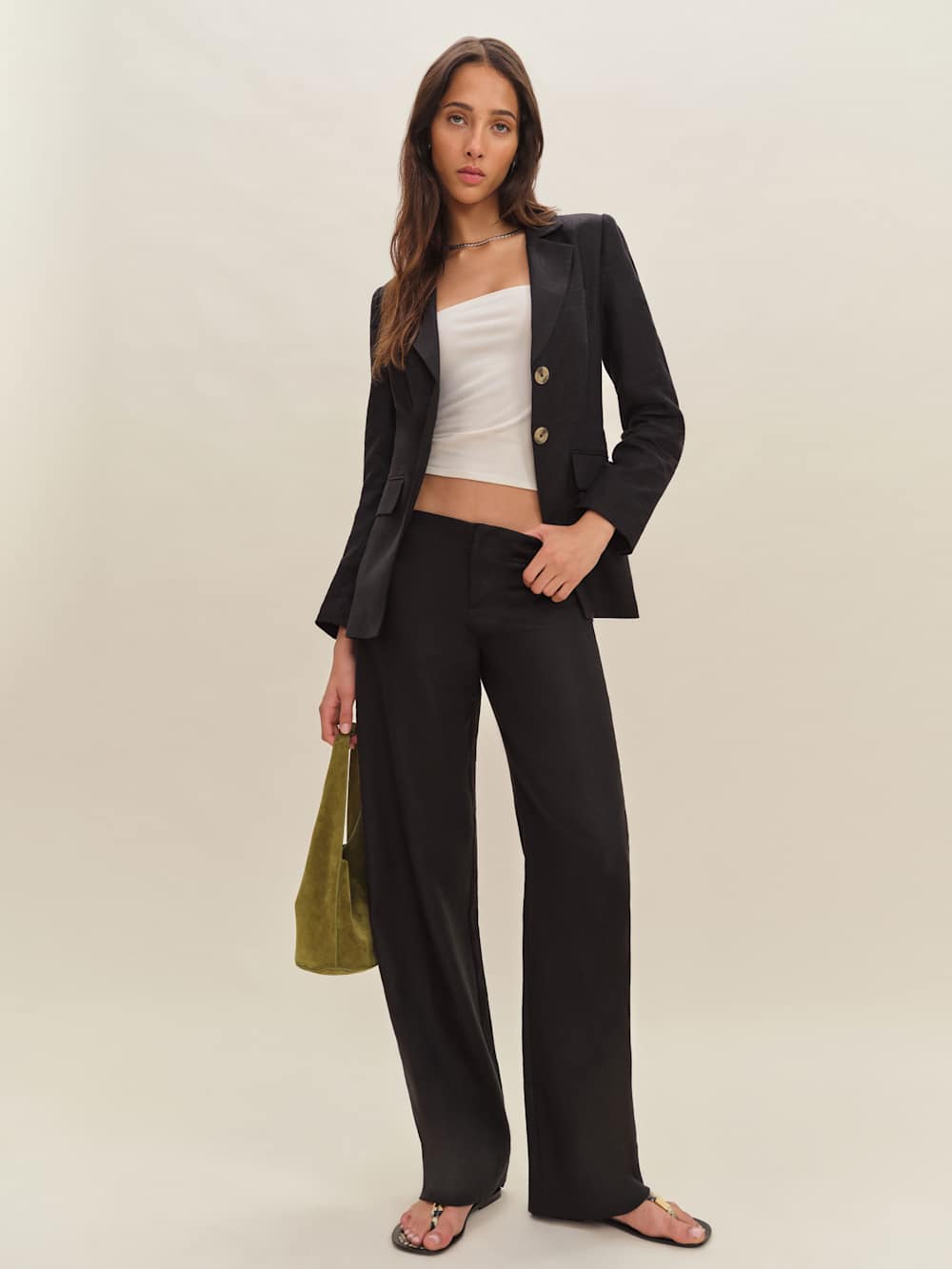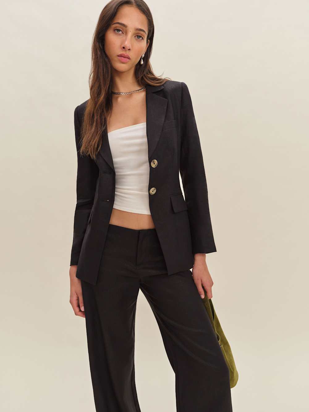 Layer up. Shop the Bondi Linen Blazer from Reformation, a slim fitting blazer with a collared neckline and button front.