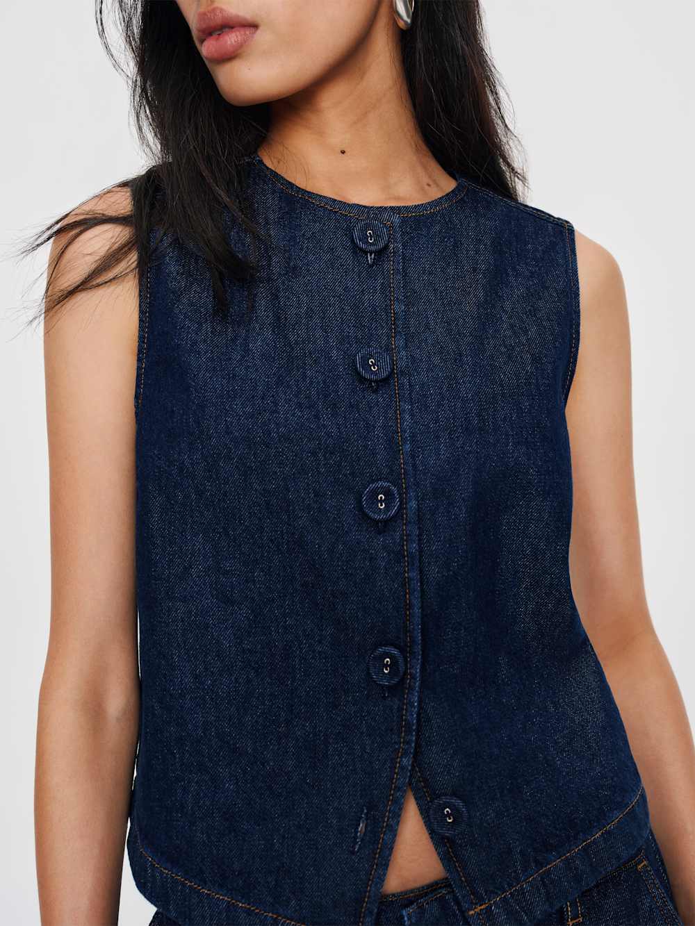 Get some compliments. Shop the Bonnie Denim top from Reformation, a sleeveless top with a high neckline, button front, and a split hem.
