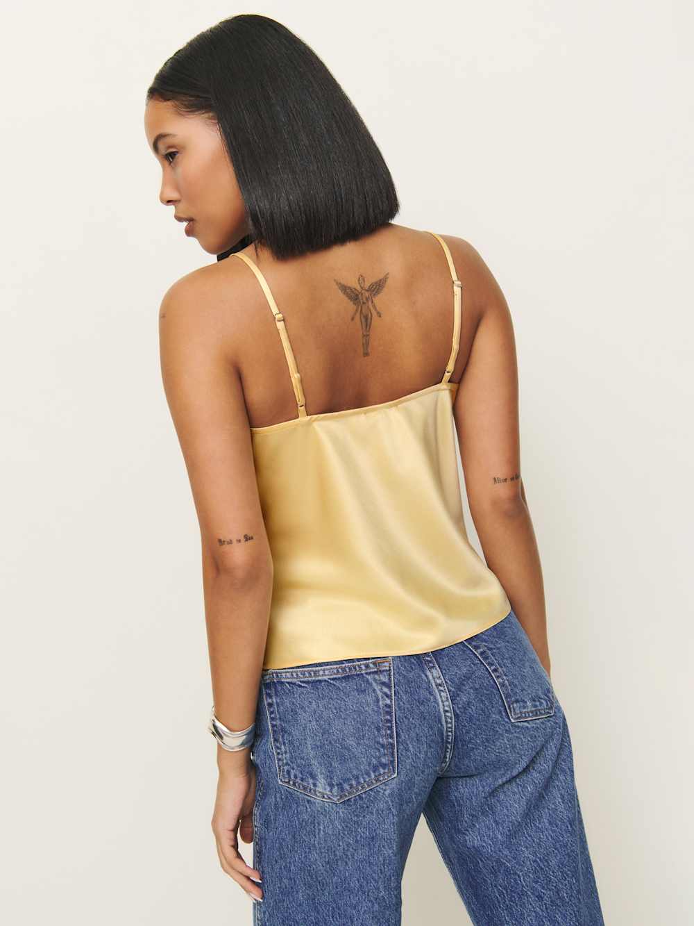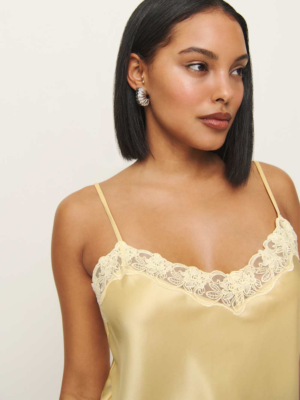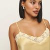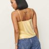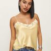Up top. Shop the Casey Satin Top from Reformation, a sleeveless top with a slight v-neckline featuring lace trim.