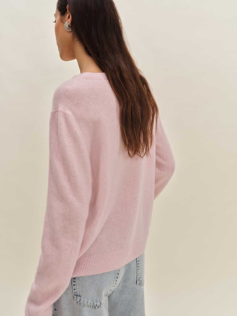 This is a fine-gauge recycled cashmere blend sweater knit – 95% Recycled Cashmere, 5% Cashmere. Hand wash + dry flat.