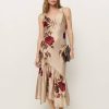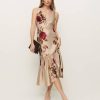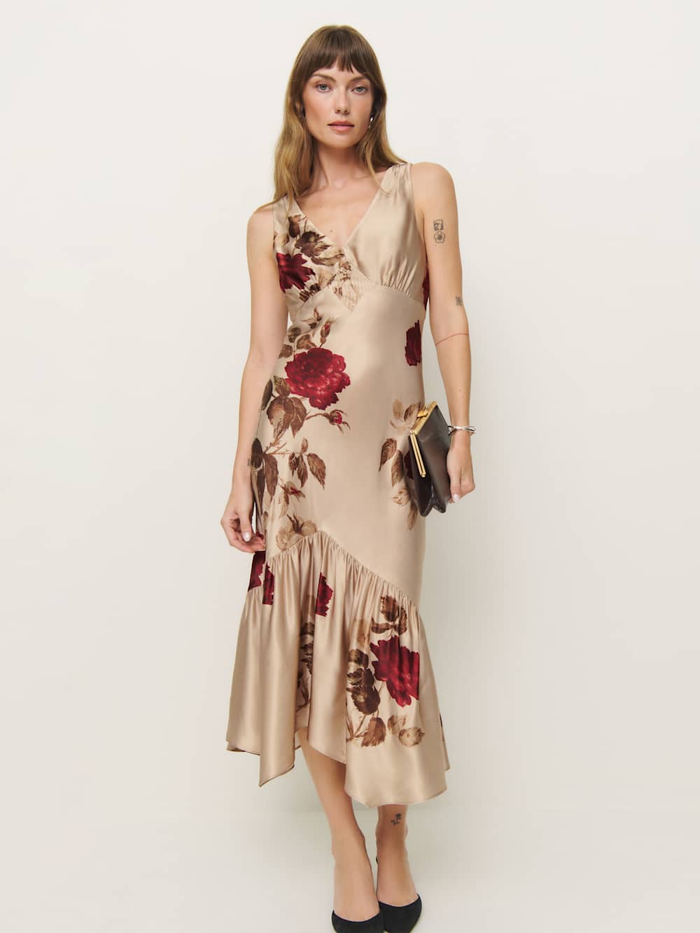 Get some compliments. Shop the Cordia Silk Dress from Reformation, a sleeveless midi dress with a V-neckline, ruffle hem, and ruching at the bust.