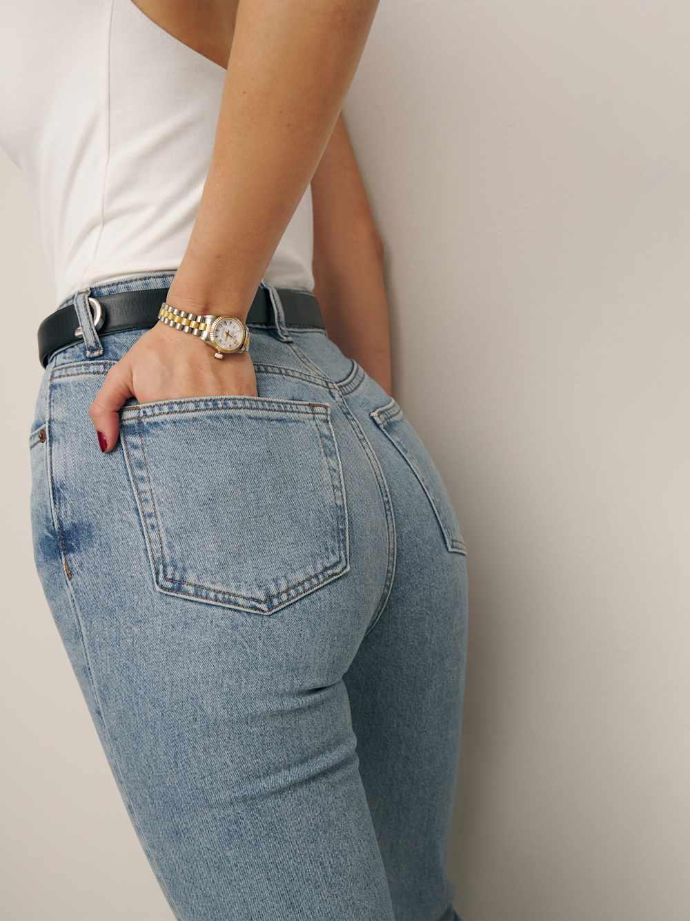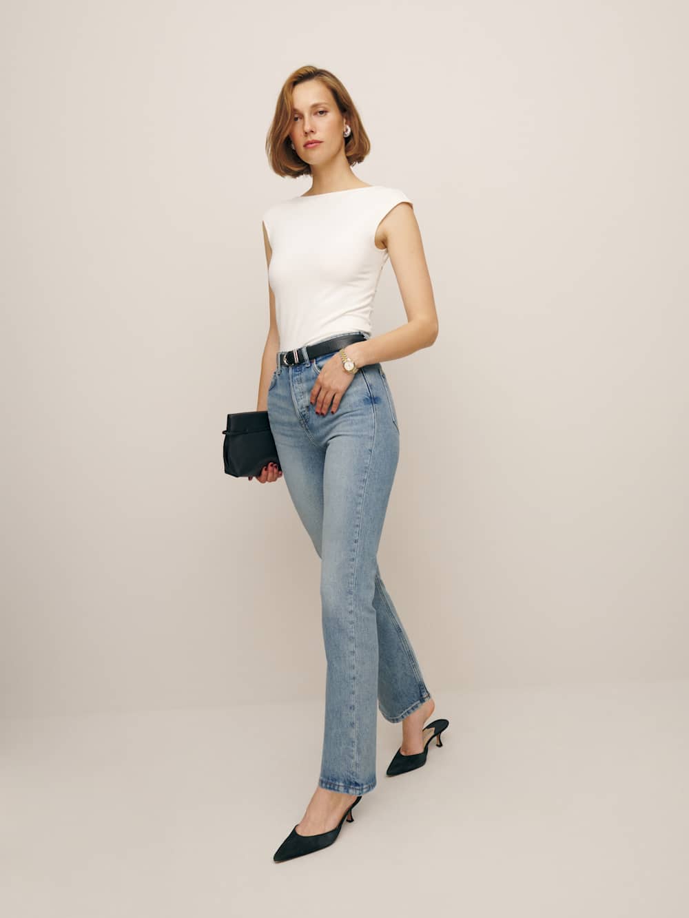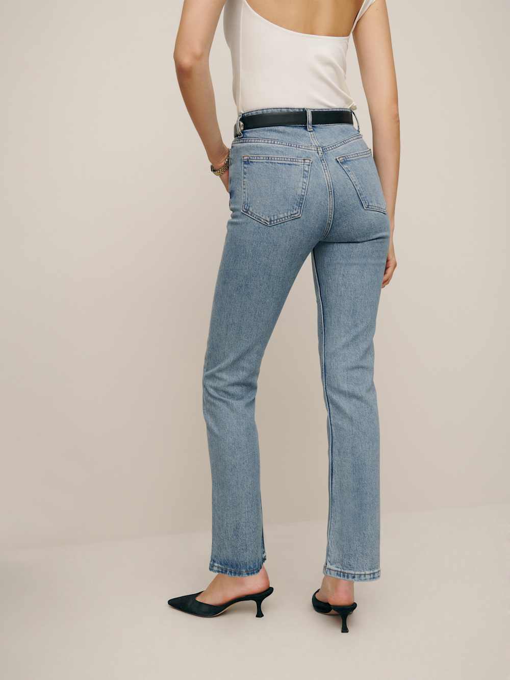 Just an honest pair of jeans. Shop the Cynthia Stretch High Rise Straight Jeans from Reformation, an ankle length jean with a fitted waist and relaxed leg.