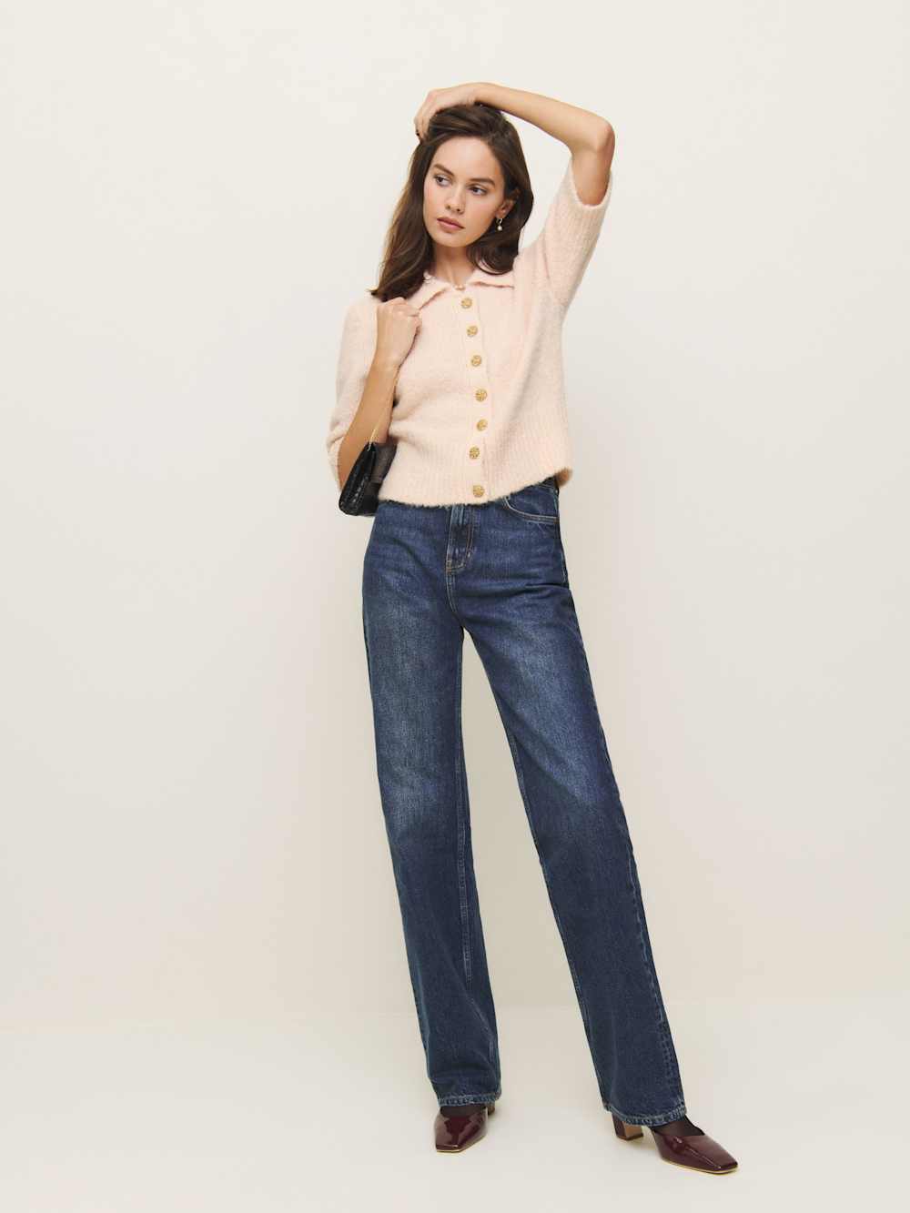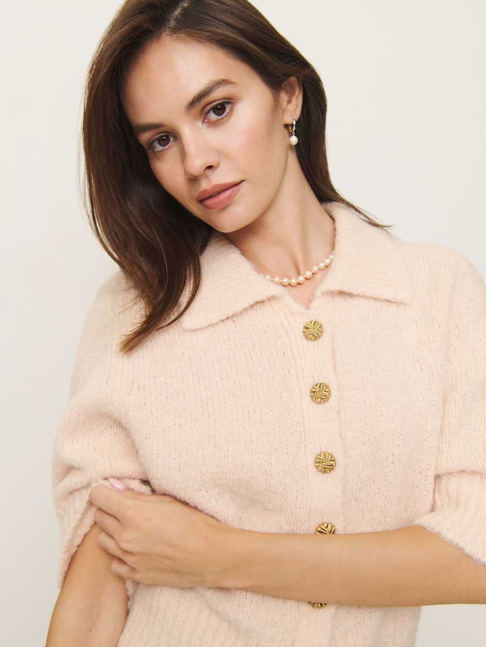 Layer up. Shop the Daphne Collared Cardigan from Reformation, a short sleeve cardigan with a button front and thick ribbing at the sleeves and hem.