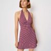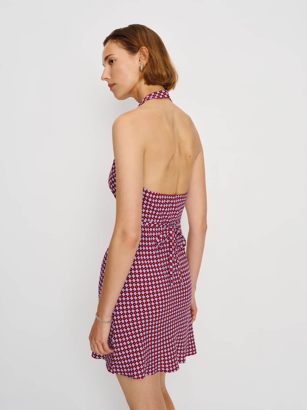 Let those legs out. Shop the Delanie Dress from Reformation, a sleeveless dress with a deep v-neckline, bust cup seams, and a tie at the back.