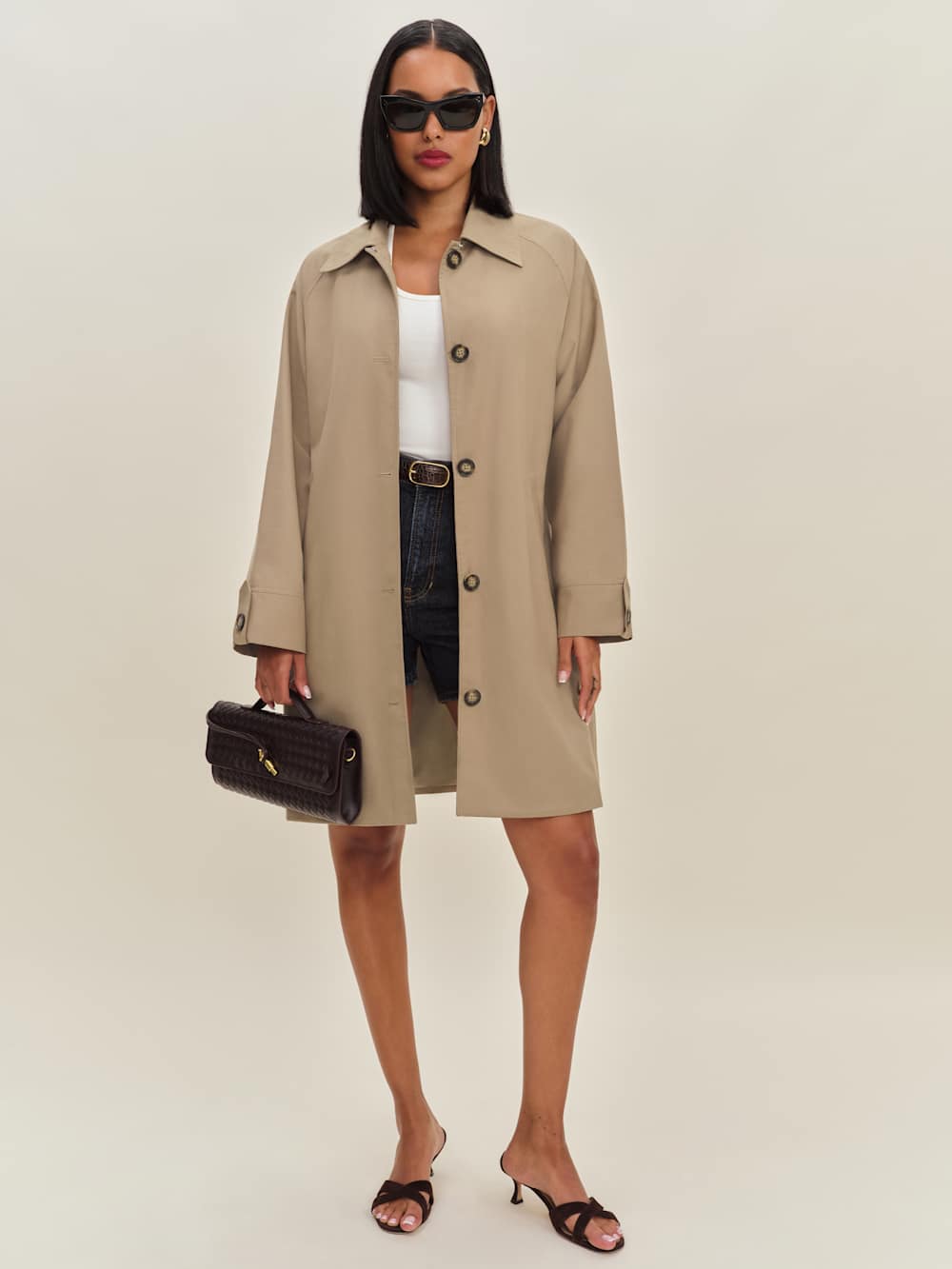 Layer up. Shop the Dion Trench from Reformation, a relaxed fitting trench coat with a collared neckline and button front.