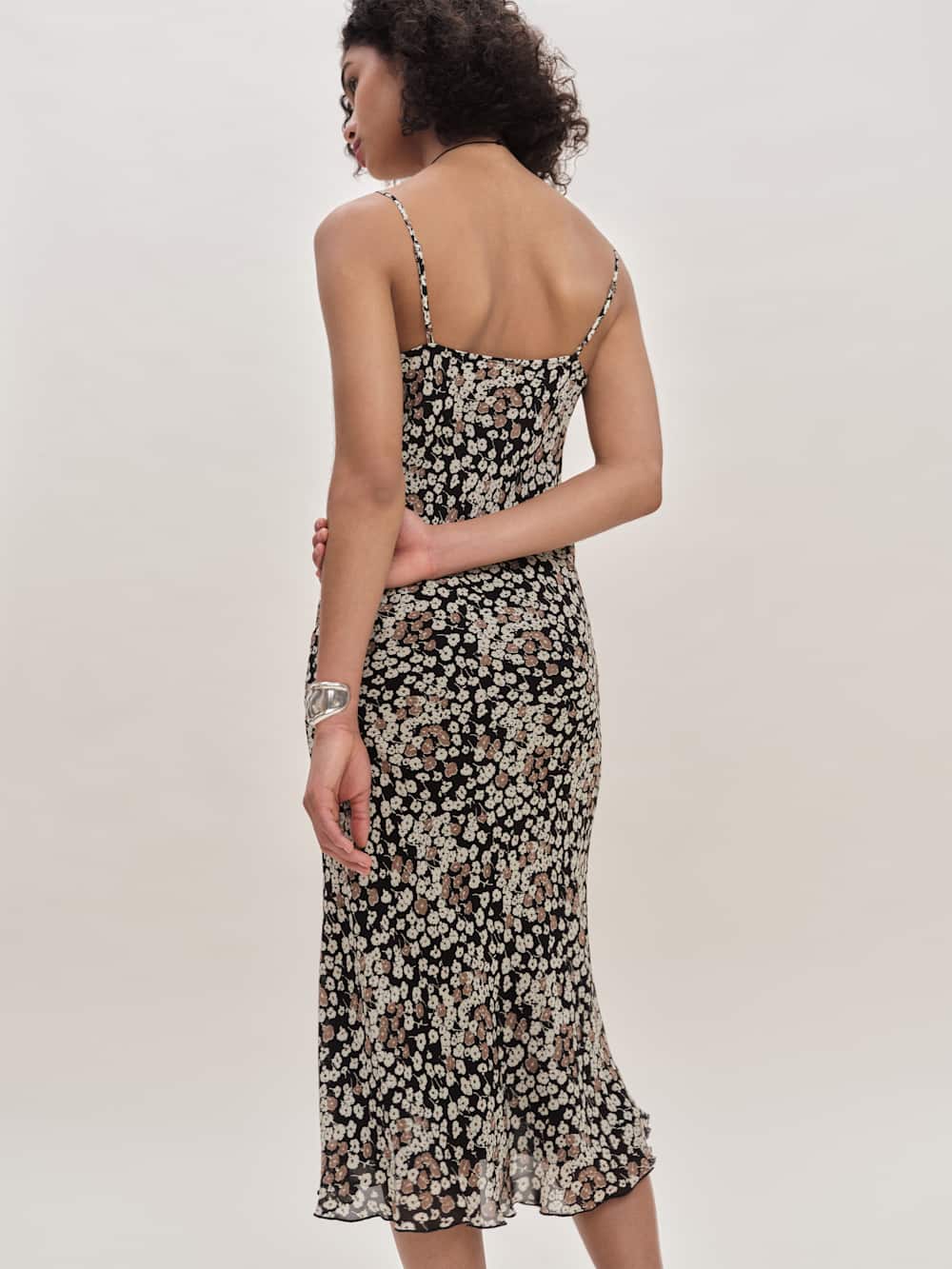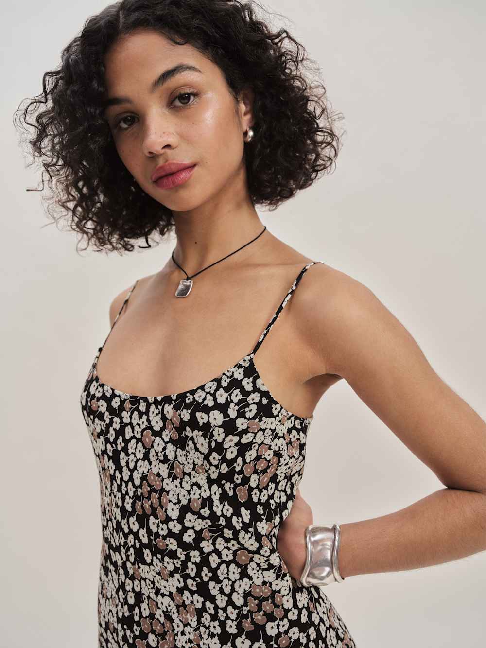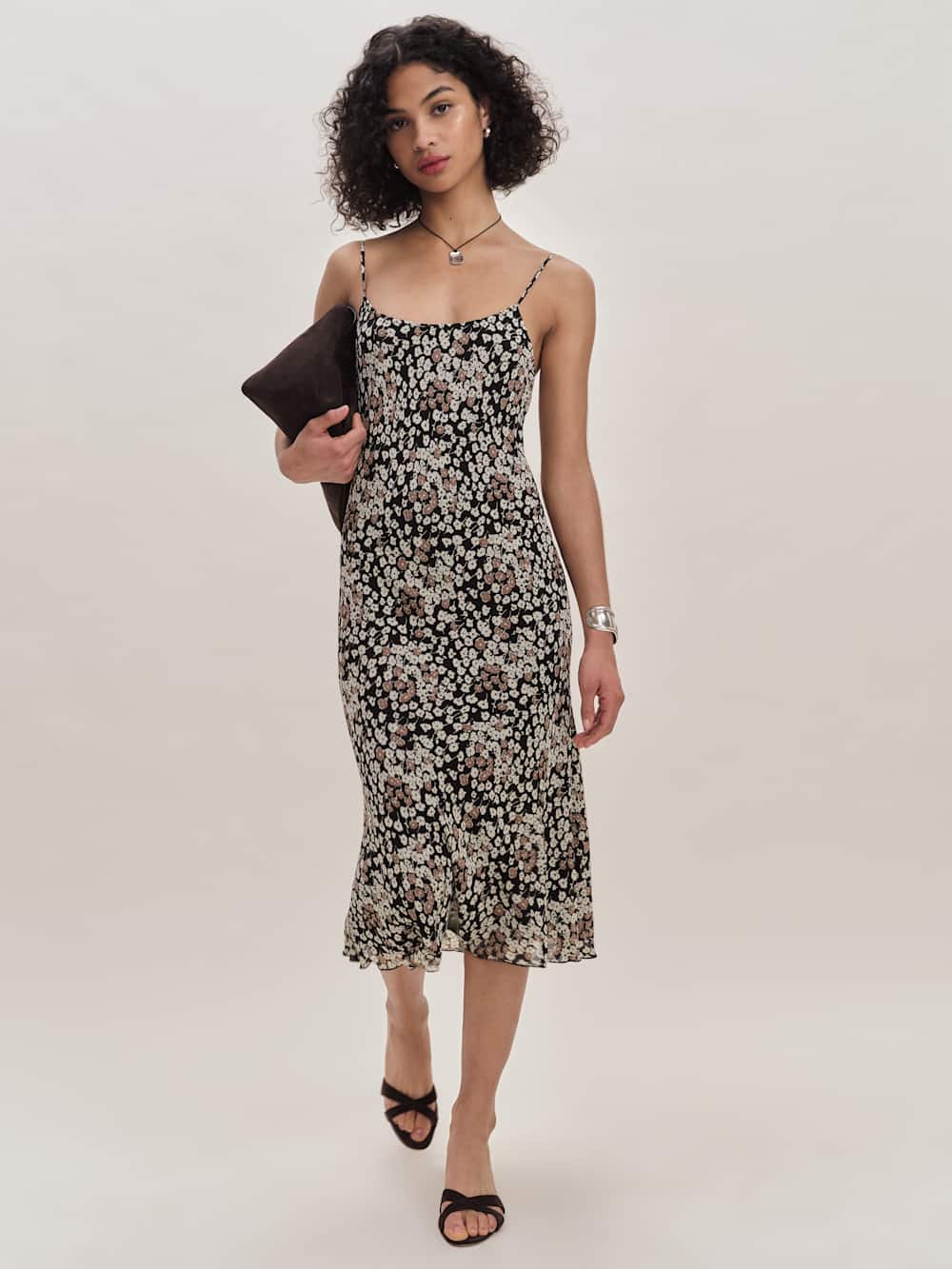 Fresh florals. Shop the Emerick Dress from Reformation, a slim fitting, slightly scooped neck, slip dress with spaghetti straps.