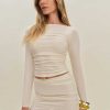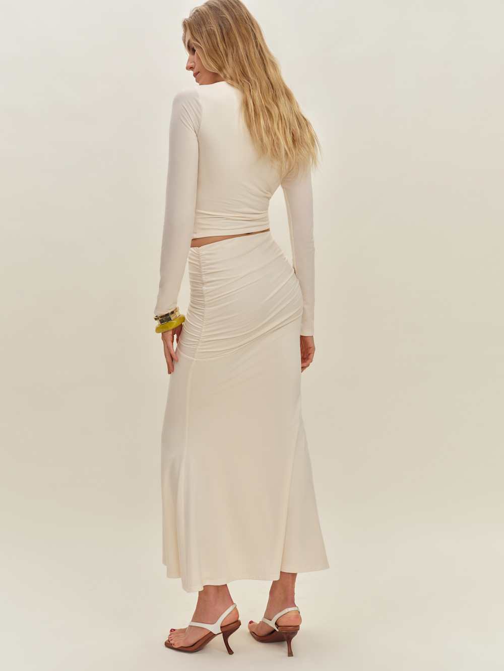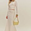 We go together. Shop the Emi Knit Two Piece from Reformation, a two piece set with a long-sleeved top and midi skirt. The set has ruching throughout.
