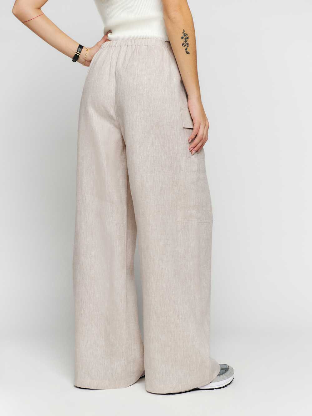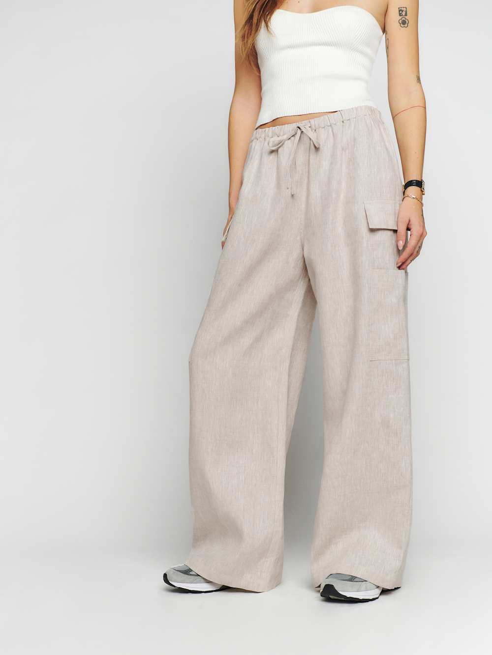 Shop the Ethan Linen Pant from Reformation, a high rise linen pant with an adjustable waist and side cargo pockets.
