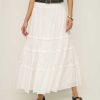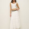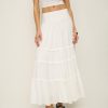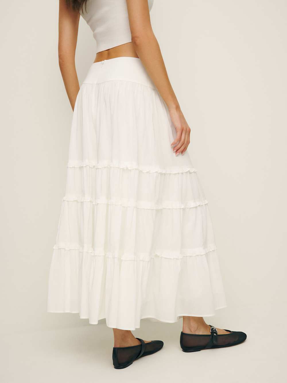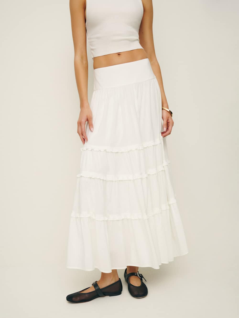 Wear the skirt. Shop the Evelina Skirt from Reformation, a high rise maxi skirt with a drop waist and tiered ruffle detailing.