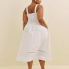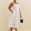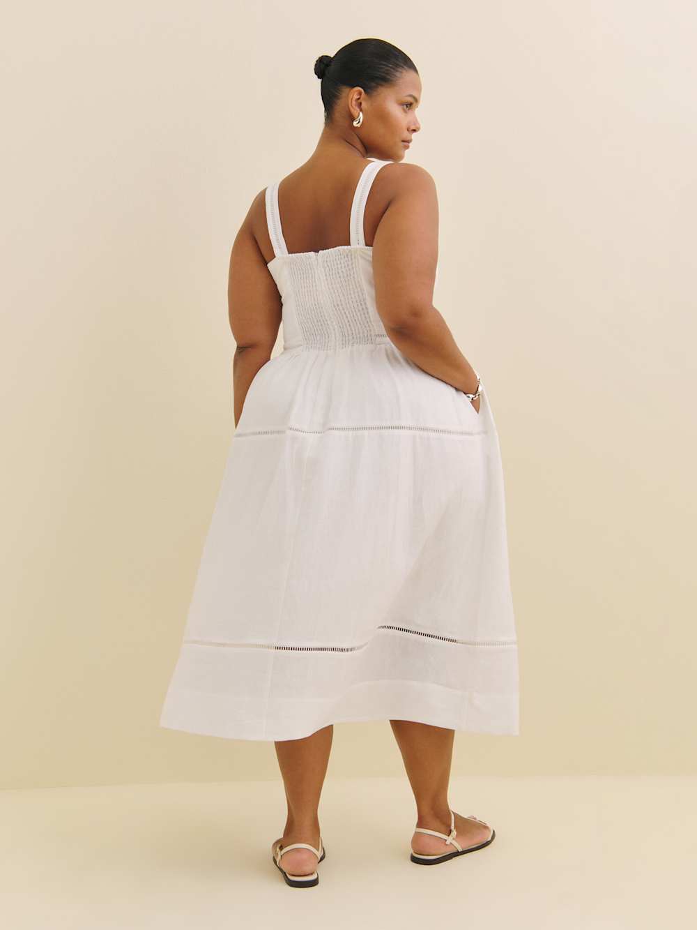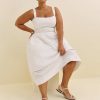How classic. Shop the Everett Linen Dress ES from Reformation, a sleeveless midi dress with a square neckline, fitted bust, relaxed skirt, and embroidery.