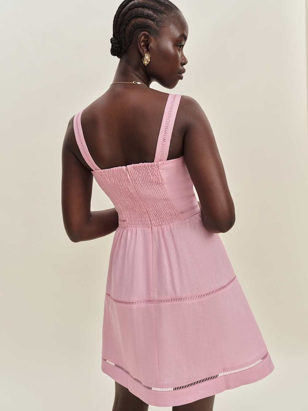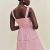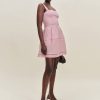 Shop the Everett Mini Linen Dress from Reformation, a sleeveless mini dress with a square neckline and pleated skirt.