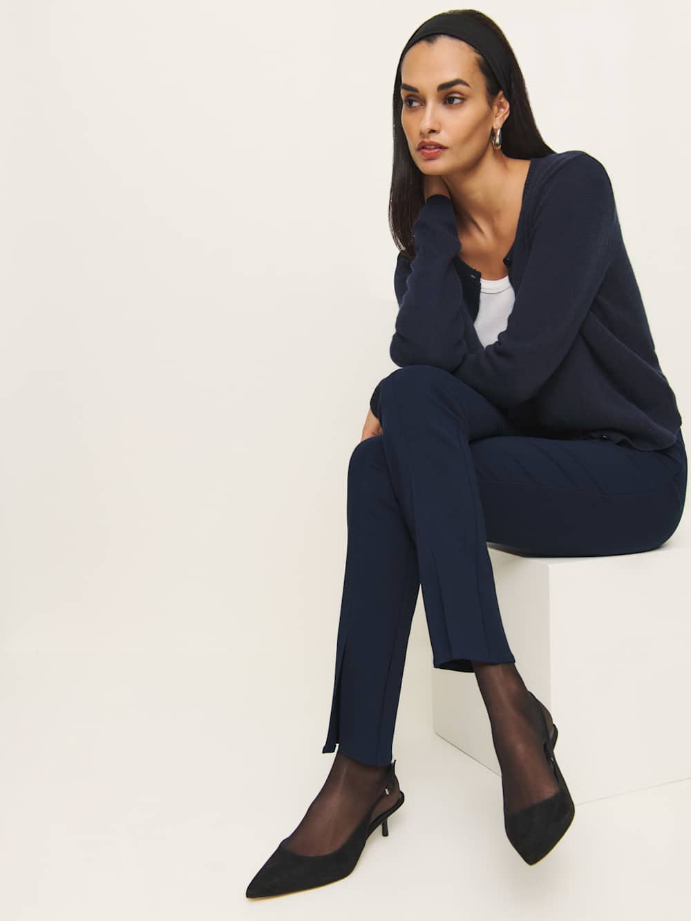 No nonsense. The Fletcher is a slim fitting, high rise pant. It is a straight cut and has a small center slit to show off a little bit of leg.
