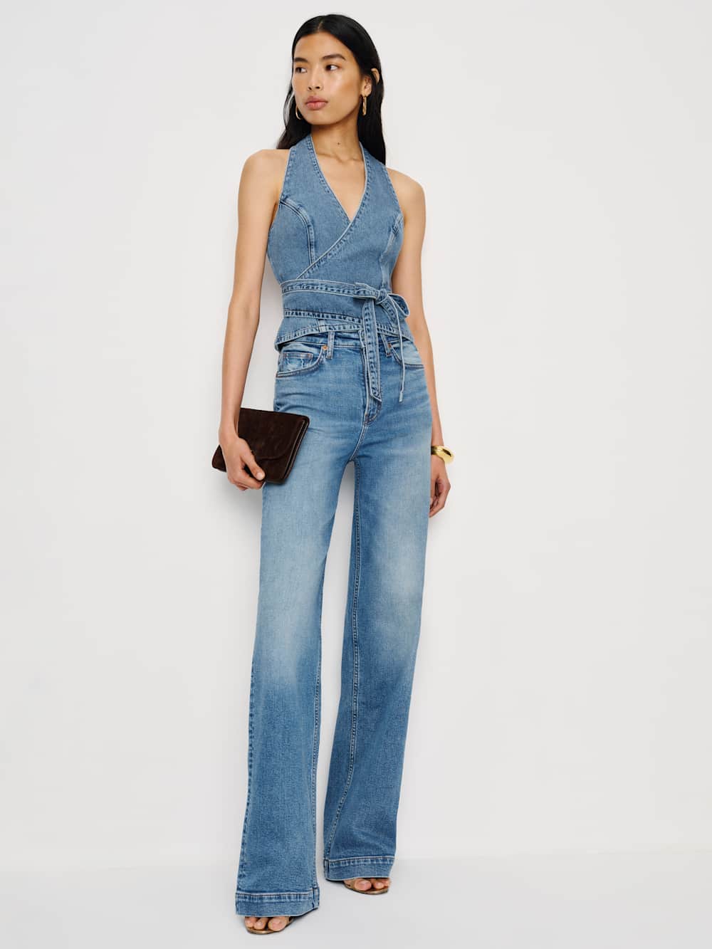 Detail oriented. Shop the Gaia Denim Halter Top from Reformation, a sleeveless halter top with a V-neckline and an adjustable bow detail.