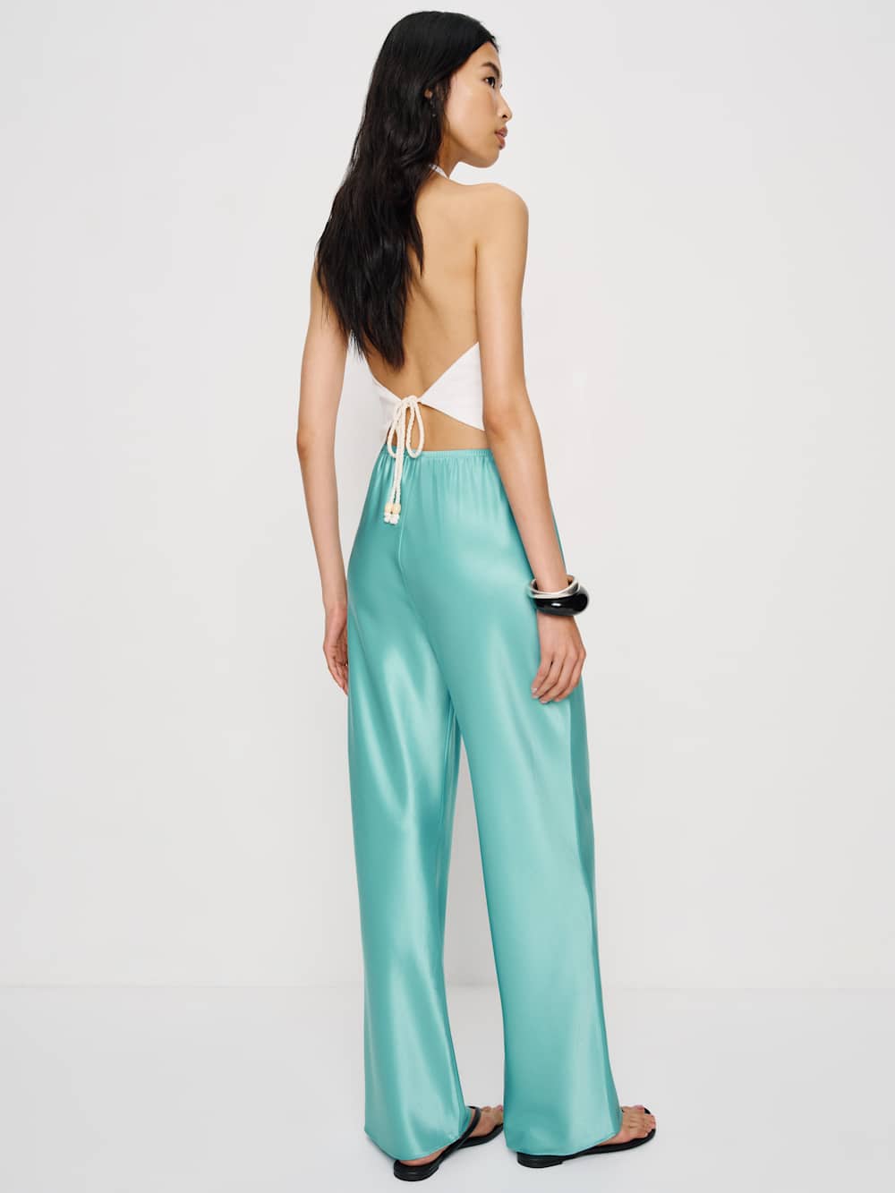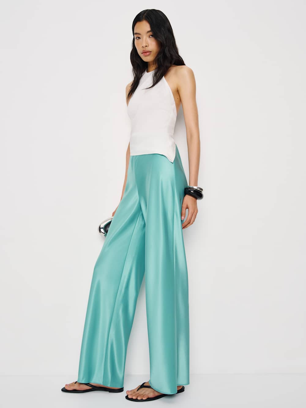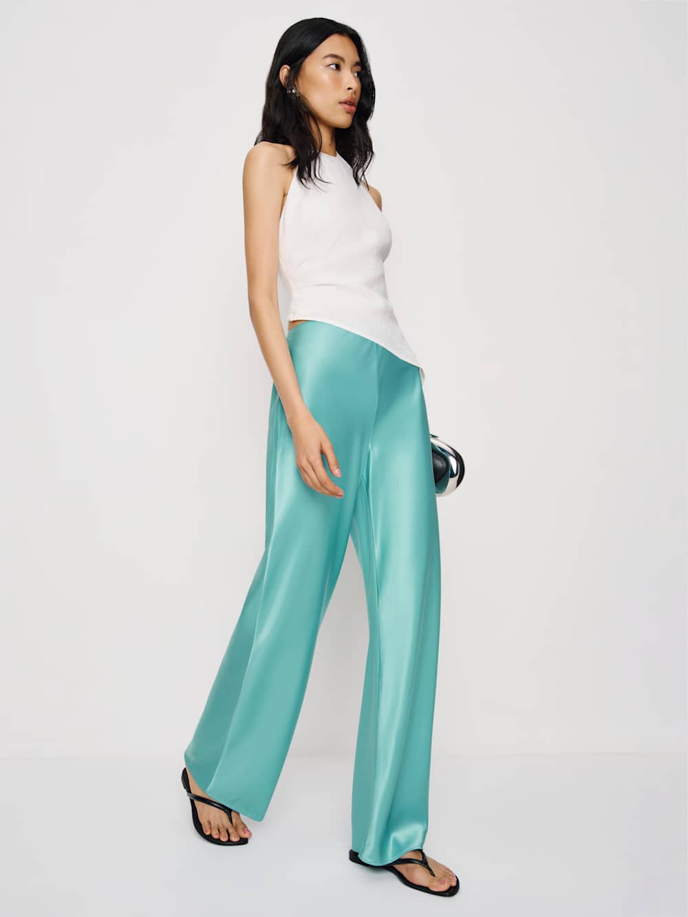 No nonsense. Shop the Gale Satin Mid Rise Bias Pant from Reformation, a mid rise, bias cut pant with an elastic waistband.