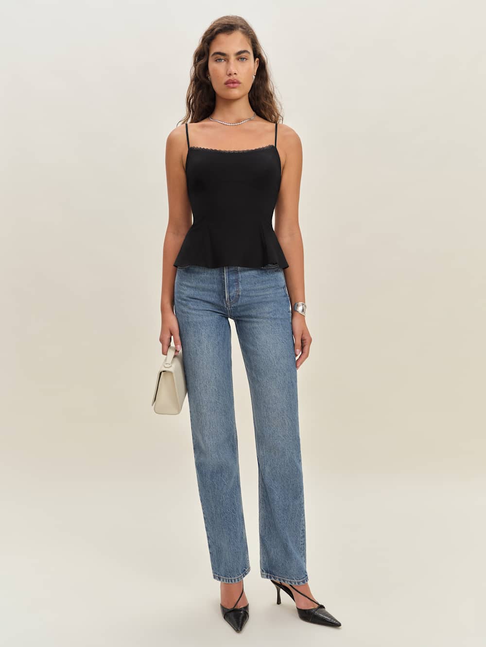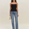 Up top. Shop the Genevieve Top from Reformation, a sleeveless top with a curved neckline, lace trim at the bust, and a peplum hem.