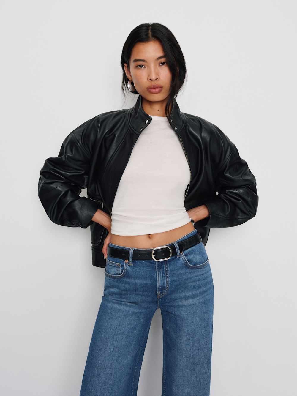 Denim – your uniform since forever. Shop the Greta Super Stretch Low Rise Wide Leg Long Jeans, sustainable jeans from Reformation.