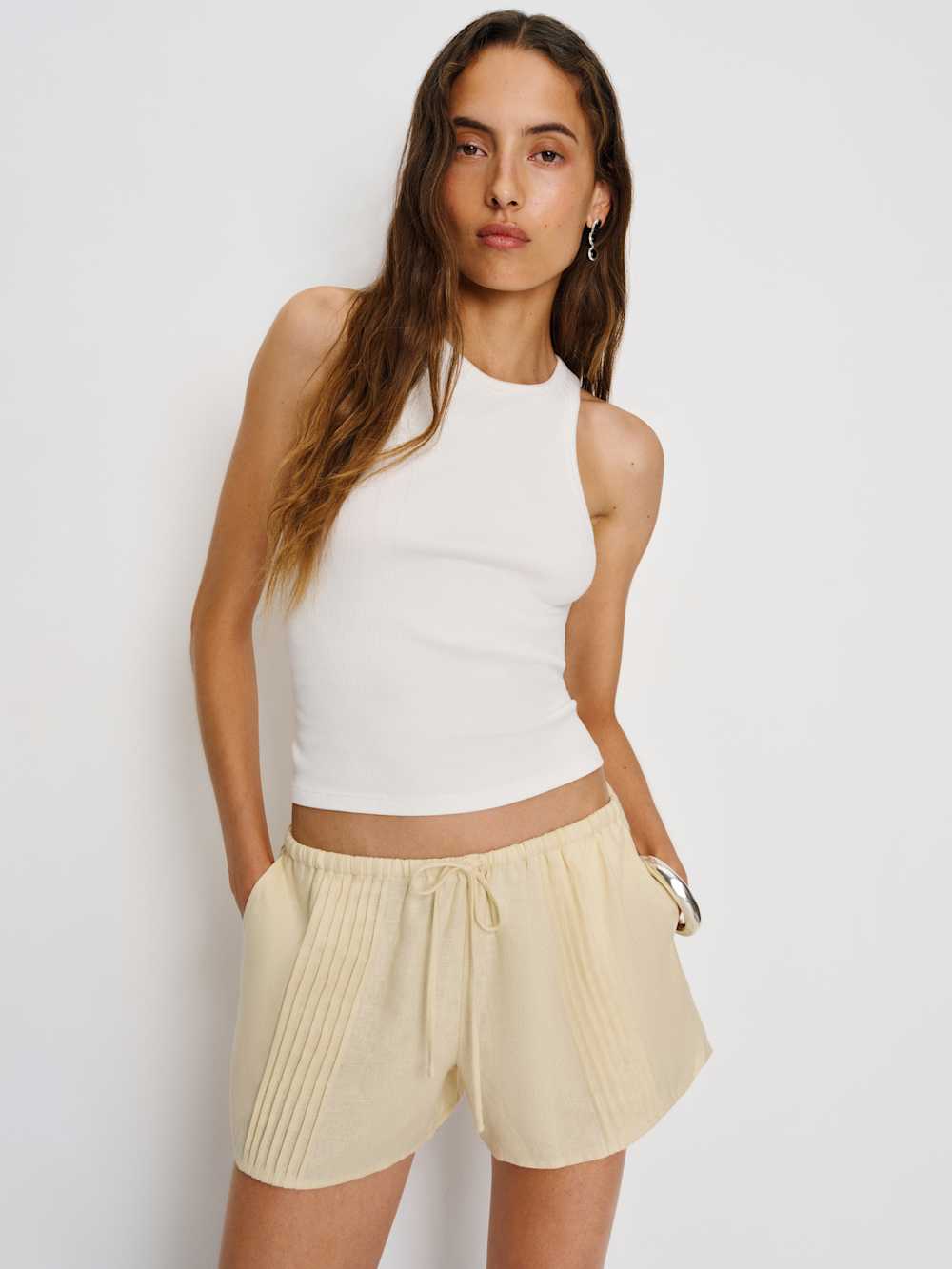 For when the temps go up. Shop the Hannah Linen Low Rise Short from Reformation, a low-rise short with an adjustable drawstring and pleated details.