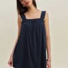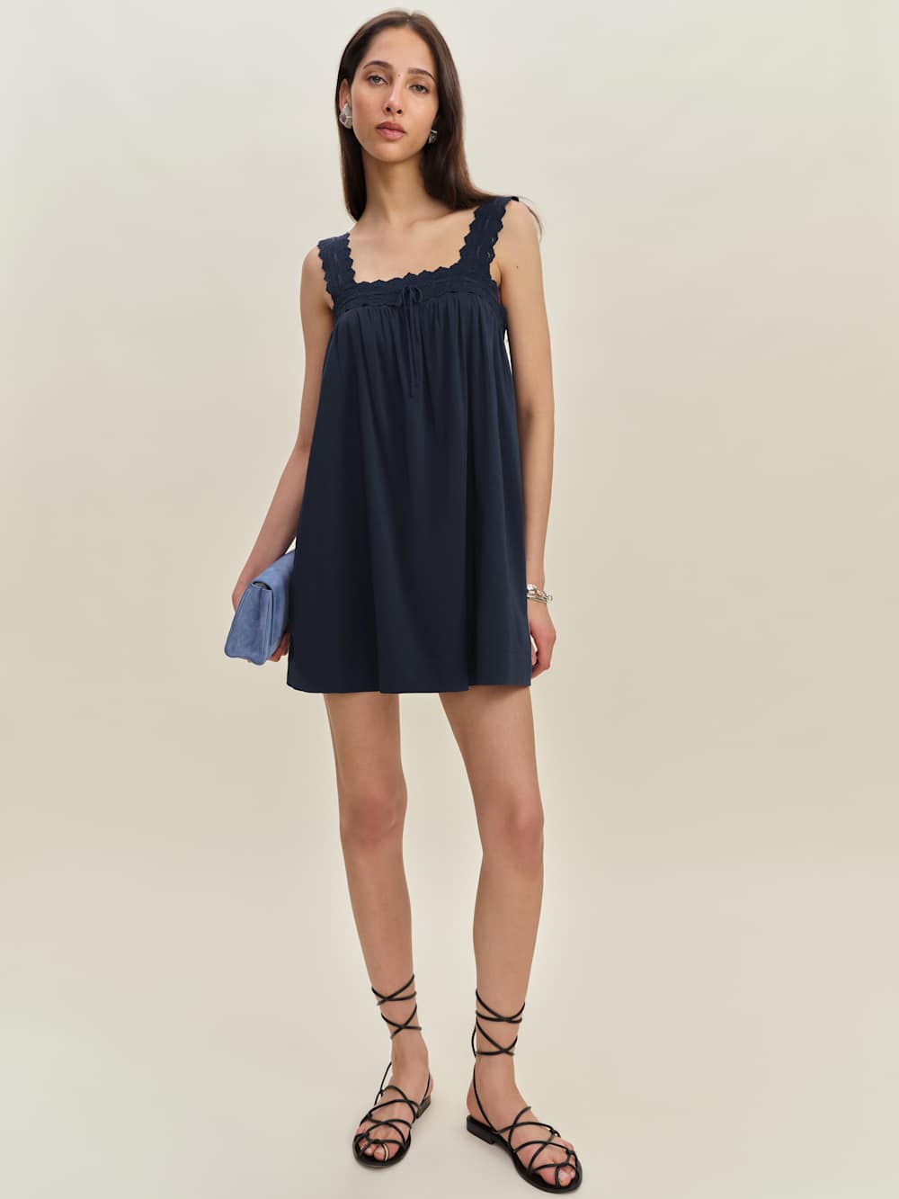 Easy little mini. Shop the Hartley Dress from Reformation, a sleeveless mini dress with a square neckline and embroidered detailing at the straps and neckline.