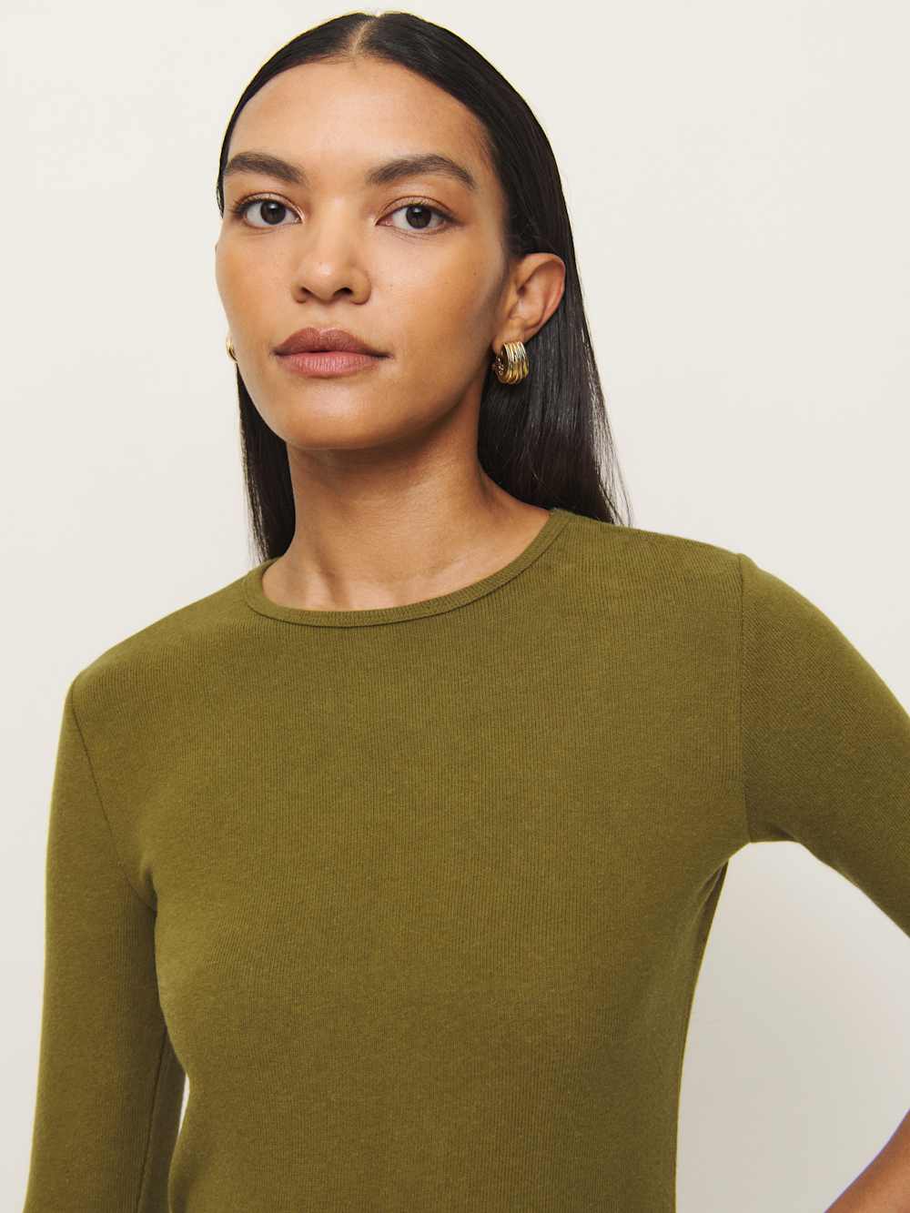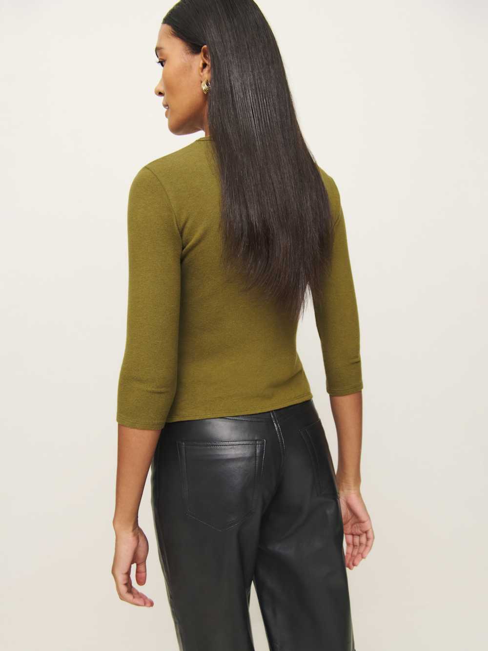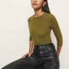 Up top. Shop the Hazel Knit Top from Reformation, a knit top with 3/4 length sleeves and a crew neckline.