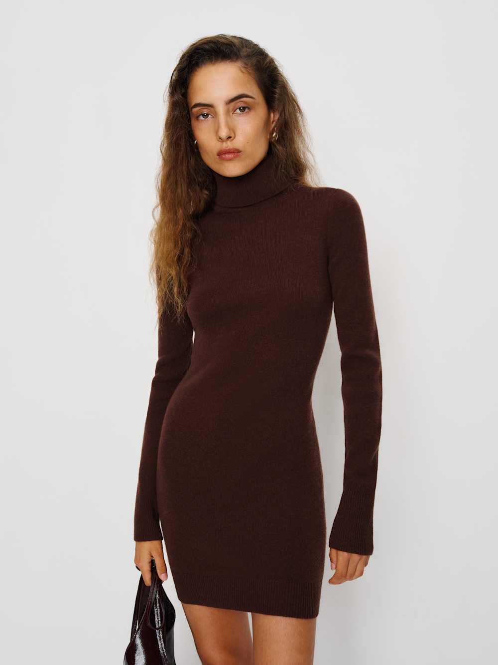 No nonsense. Shop the Helly Cashmere Turtleneck Dress from Reformation, a long-sleeved mini dress with a turtleneck and slim fit.
