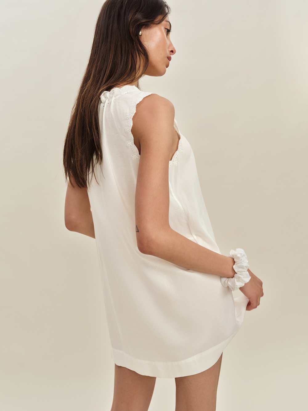 Sweet Dreams. Shop the Holly Sleep Dress from Reformation, a sleeveless mini dress with embroidered straps, an adjustable tie at the neck, and button front.