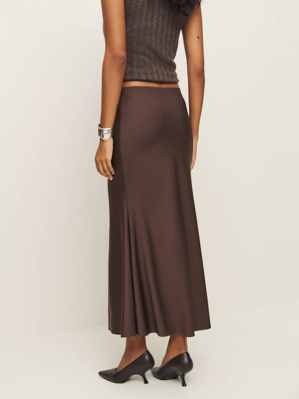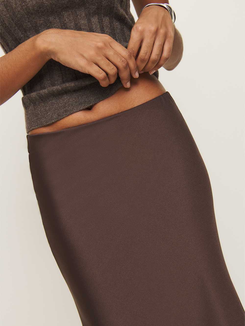 Wear the skirt. Shop the Isabella Knit Skirt from Reformation, a mid-rise, flared maxi skirt with a slim fit throughout the hips.