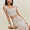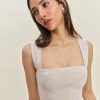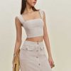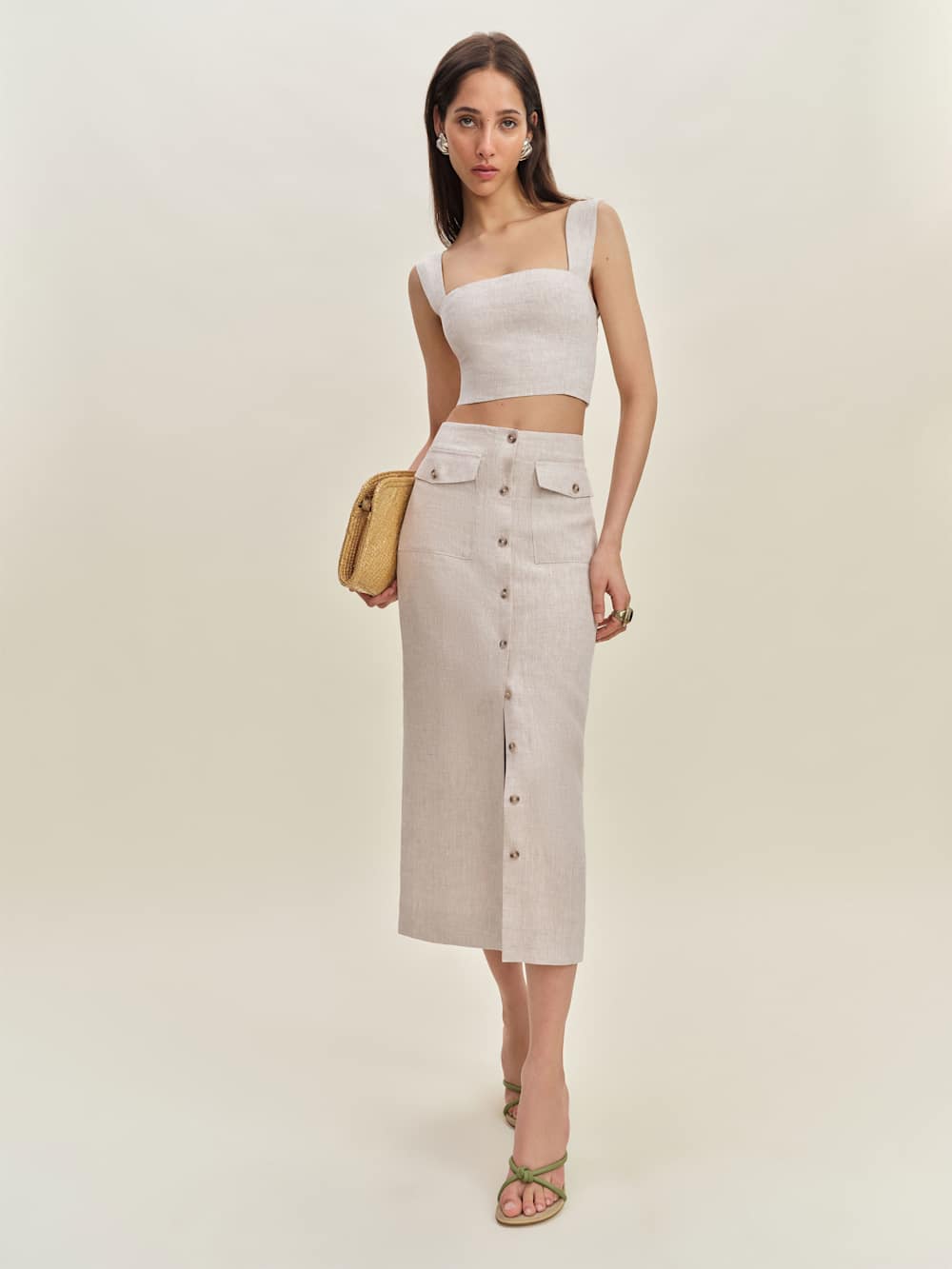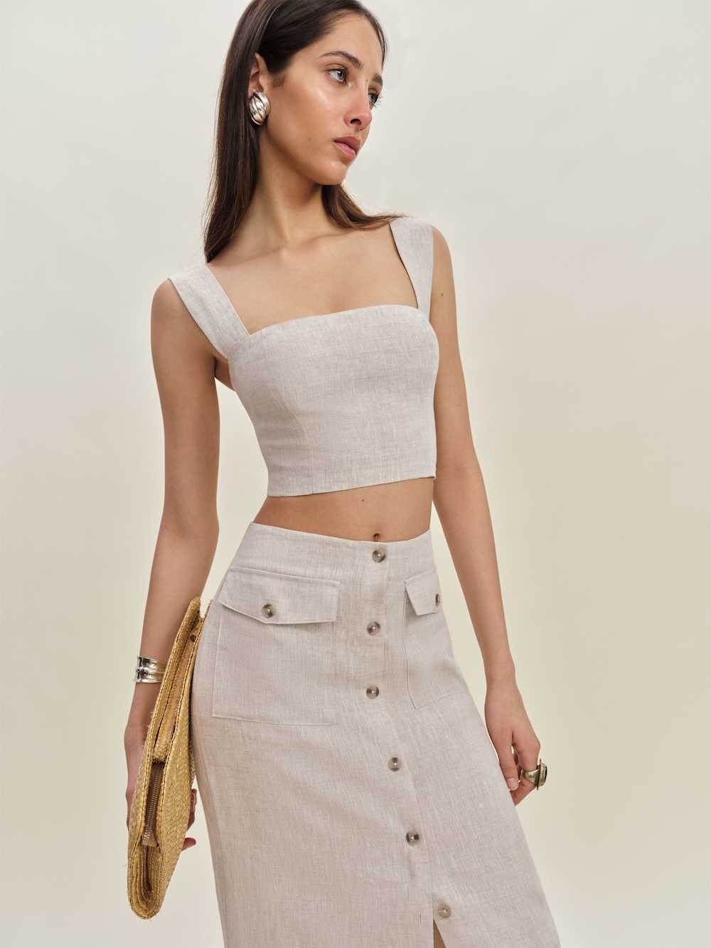 Up top. Shop the Jasmine Linen Top from Reformation, a sleeveless cropped top with a square neck and thick shoulder straps.