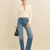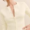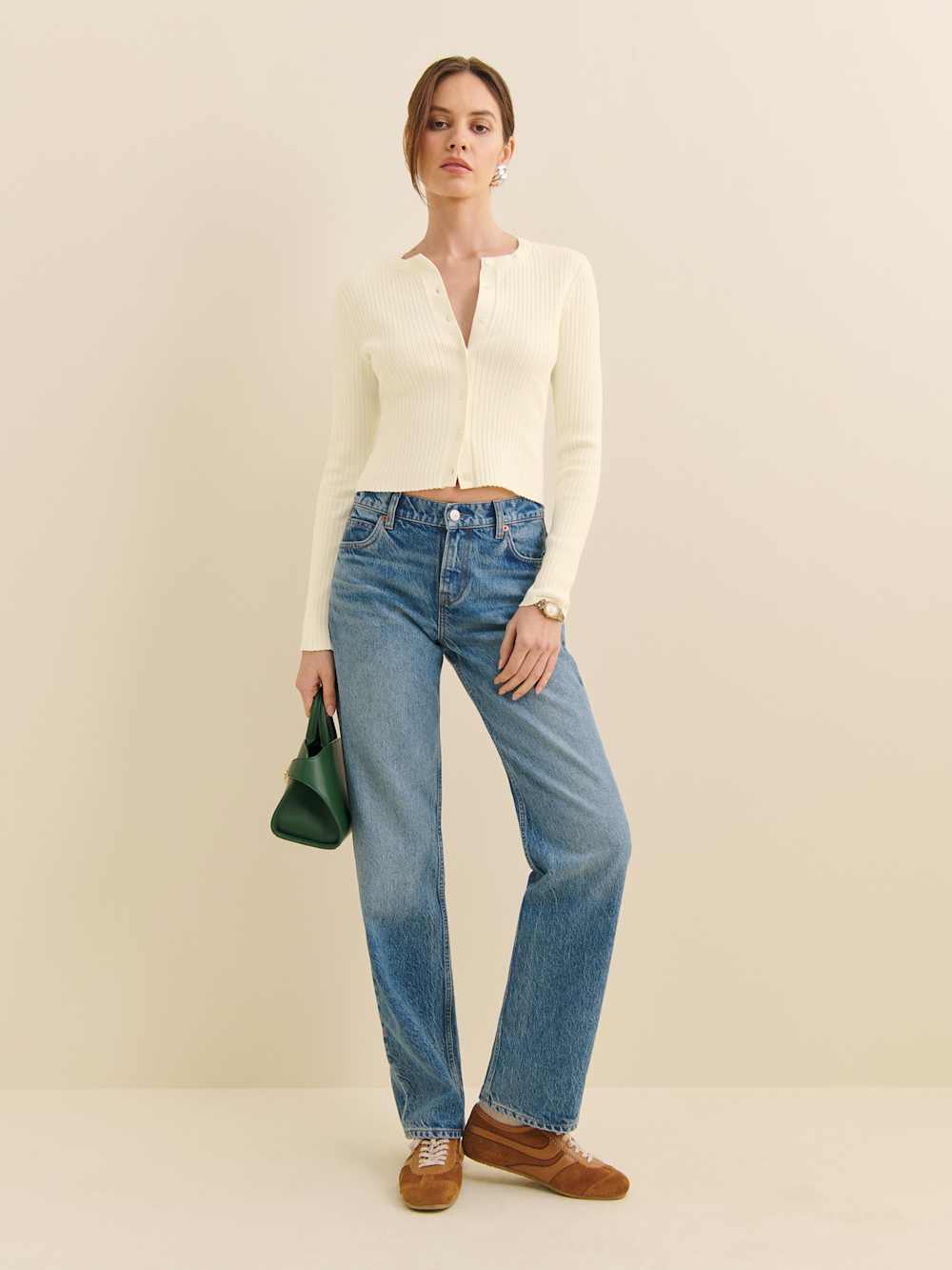Be nice to your bottoms and get them some good tops. Shop the Joanne Cotton Cardigan from Reformation, a long sleeve, ribbed, crewneck cardigan.