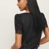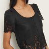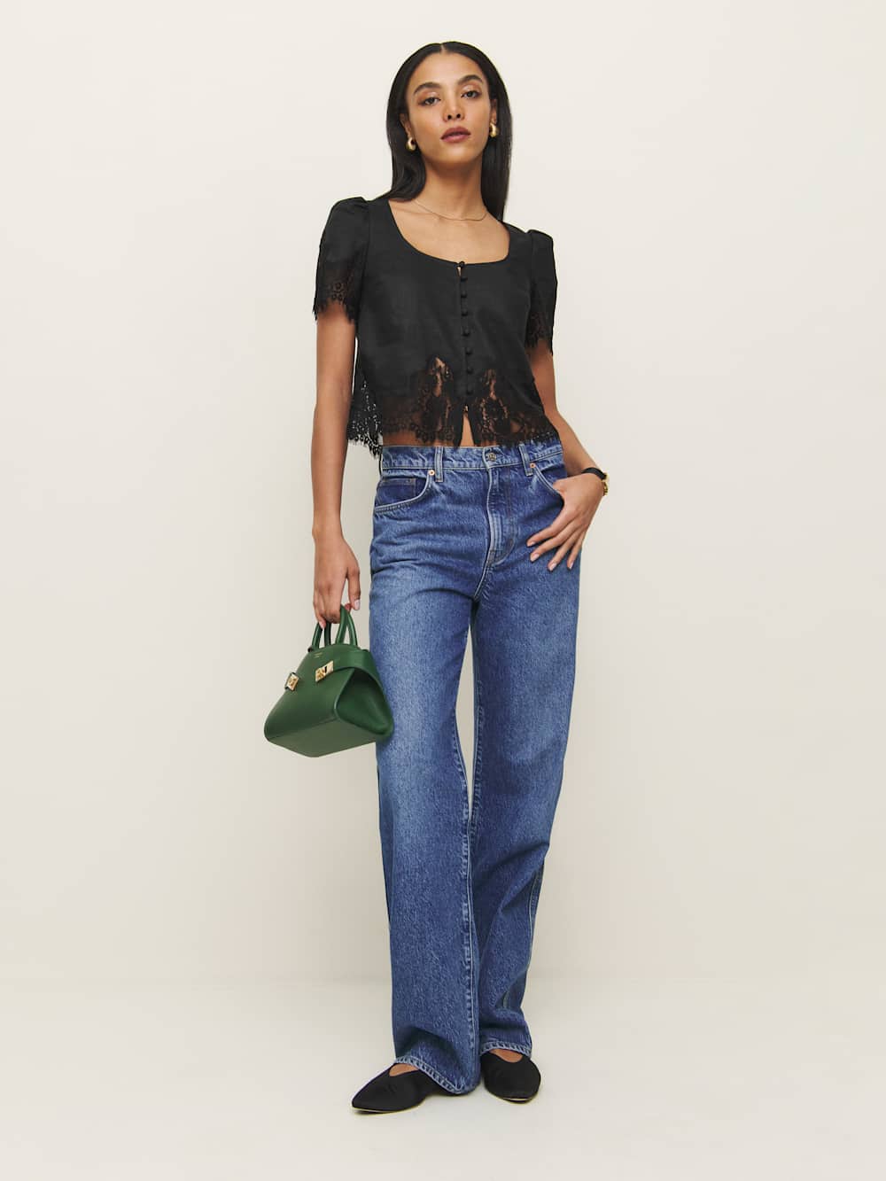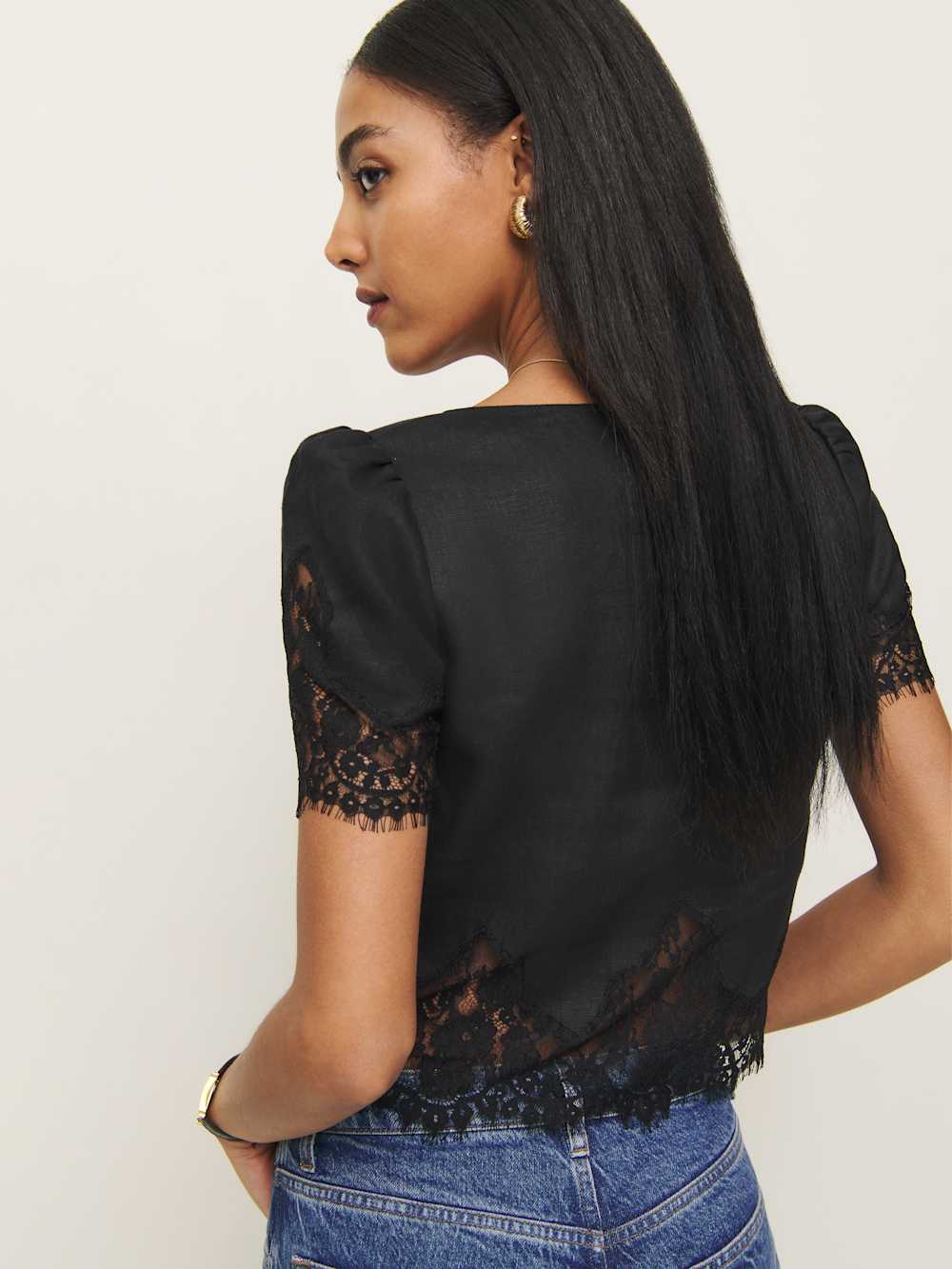Up top. Shop the Josie Linen Top from Reformation, a short-sleeved top with a scoop neckline, button front, and lace detailing at the sleeve and hem.
